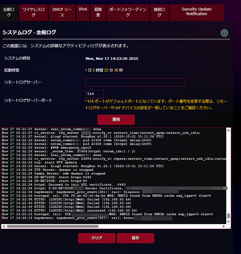 とにかくネットワークに関する設定項目の多さがROG Strix GS-BE7200Xのポイント。民生機でありながらビジネス向けと同様レベルの設定項目を用意していることがよく分かるかと。また、システムログなどについても非常に詳細に記録されるためなにか問題が発生したときにはログから詳細な情報を取得できるのもポイント。ヘビーユーザーにとっても安心して利用できるのがASUSのROG Strix GS-BE7200Xというわけです。