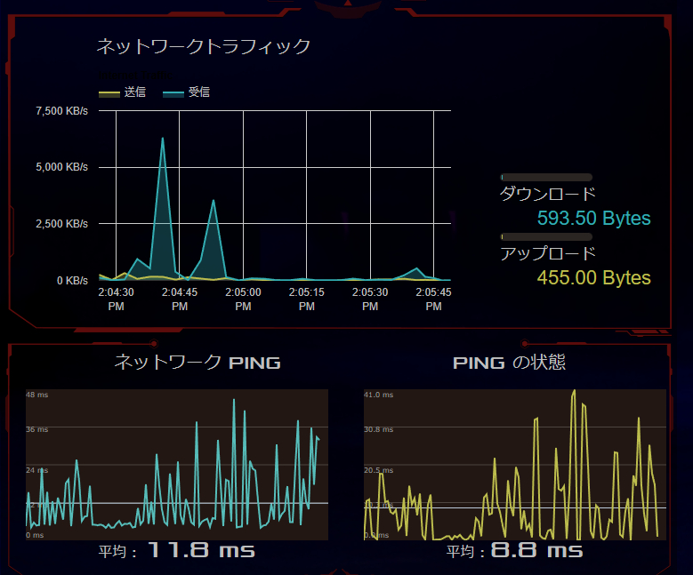 ネットワークトラフィックは常時計測されており、管理画面を開いた状態で実際にどのような状況かリアルタイムで確認が可能。万が一回線の様子が悪いというときには、この画面を開いて実際にネットワークのPINGが通っているのかなども直ぐに確認ができるわけです。