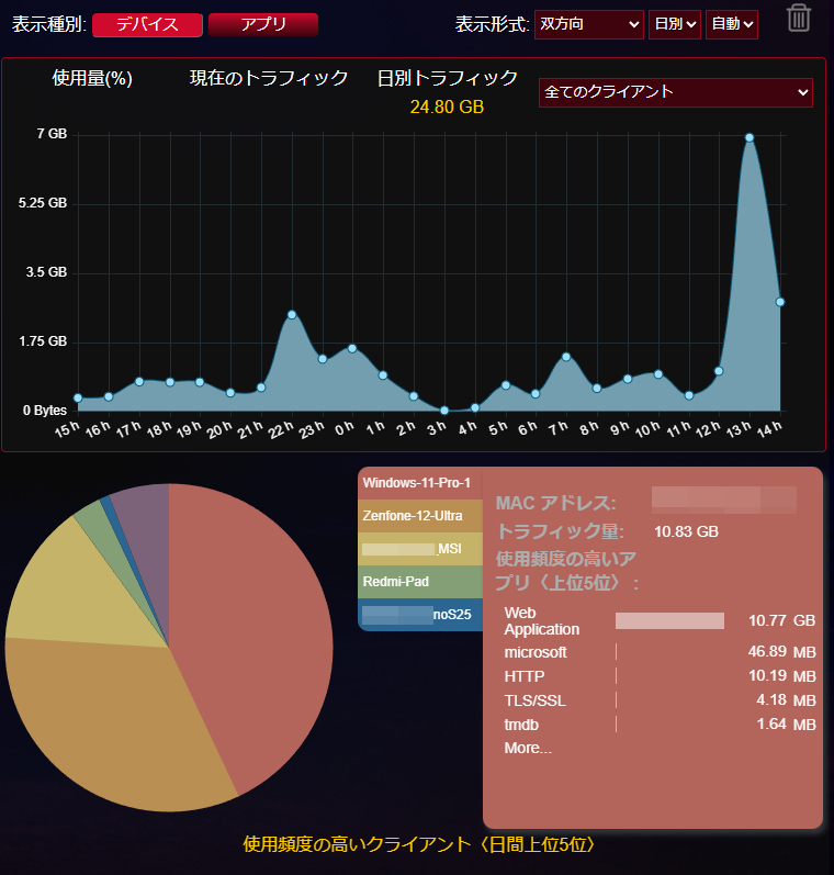 面白いのがクライアント/アプリ別での統計。どの機器がどれだけの容量を利用したのかというのを一目で確認ができるようになっています。このアナライザーではLAN内での通信もカウントされるようで、Jriver Media Centerで構築したホームメディアネットワークでクライアントとして利用したPCがダントツの結果でした。