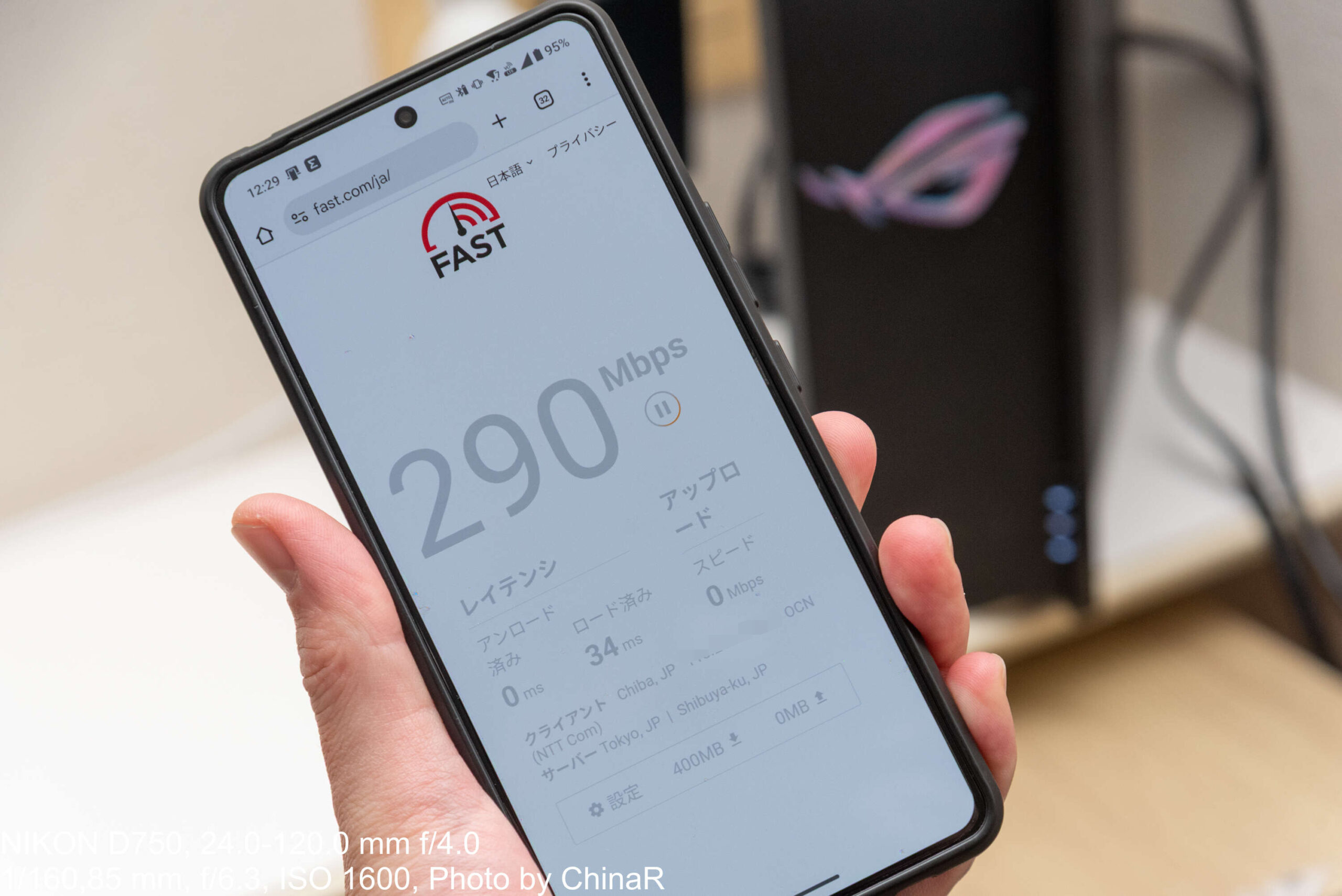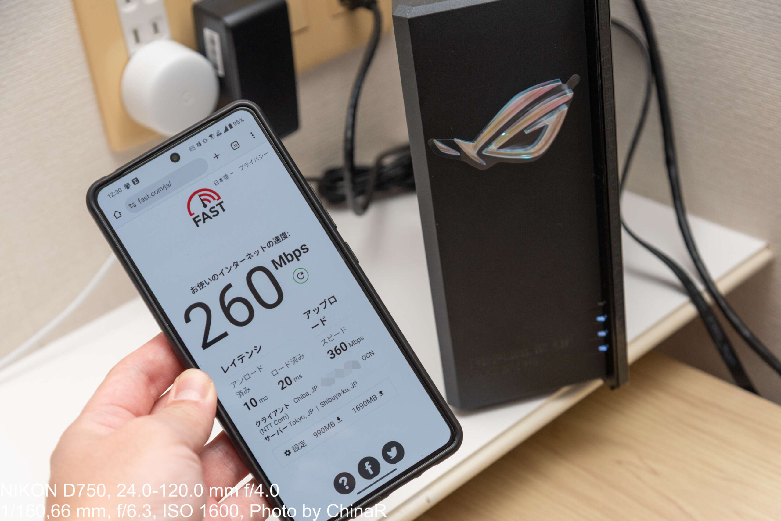 前述したように私の自宅の回線速度は実測で200~300Mbpsほど。ROG Strix GS-BE7200Xのすぐ目の前で計測するとアップロードは360Mbpsとそこそこで、レイテンシもロード済みでも20msに抑えられる一定の高速性を確保することができます。ただ、これが遠ざかった場合にどうなるのか、というのが気になるところ。なお、計測にはWi-Fi 7に対応したASUS Zenfone 12 Ultra(レビュー)を利用しました。