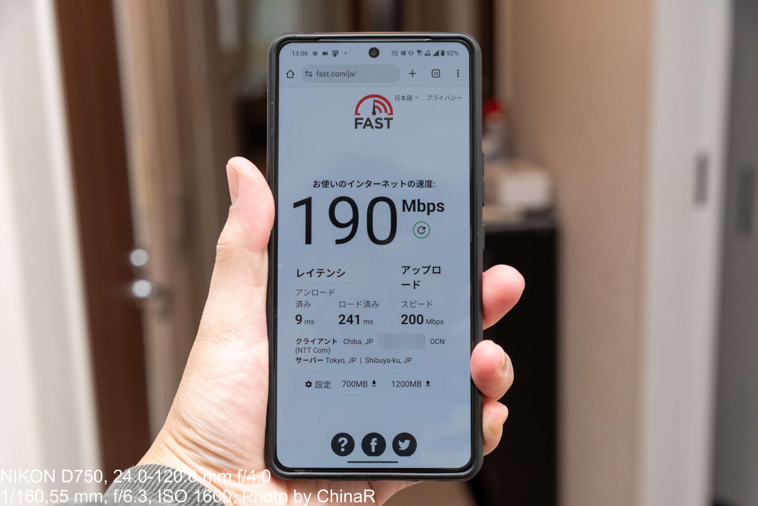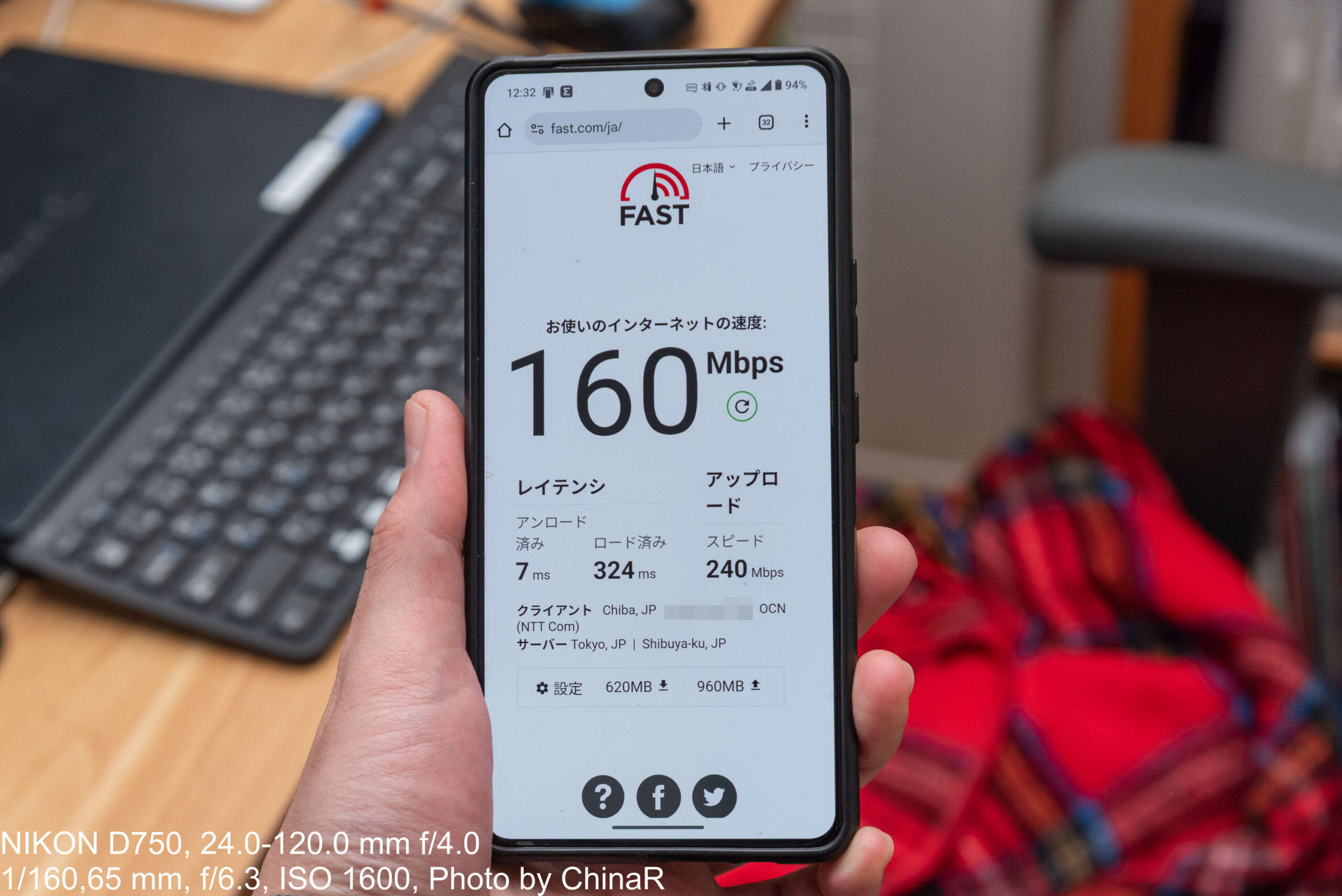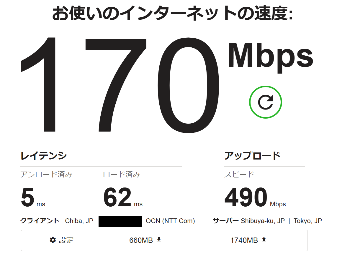 一番遠い部屋と廊下でも計測。速度はどうしても低下してしまい遠い部屋では160Mbpsという結果に。レイテンシに関しても拡大してしまっています。ただ、一定の速度は確保できているので動画視聴などは快適性を維持することができる印象。スマートフォンの場合どうしてもロード済みのレイテンシは増えてしまうので、レイテンシに関しては参考程度と見てもらえれば。