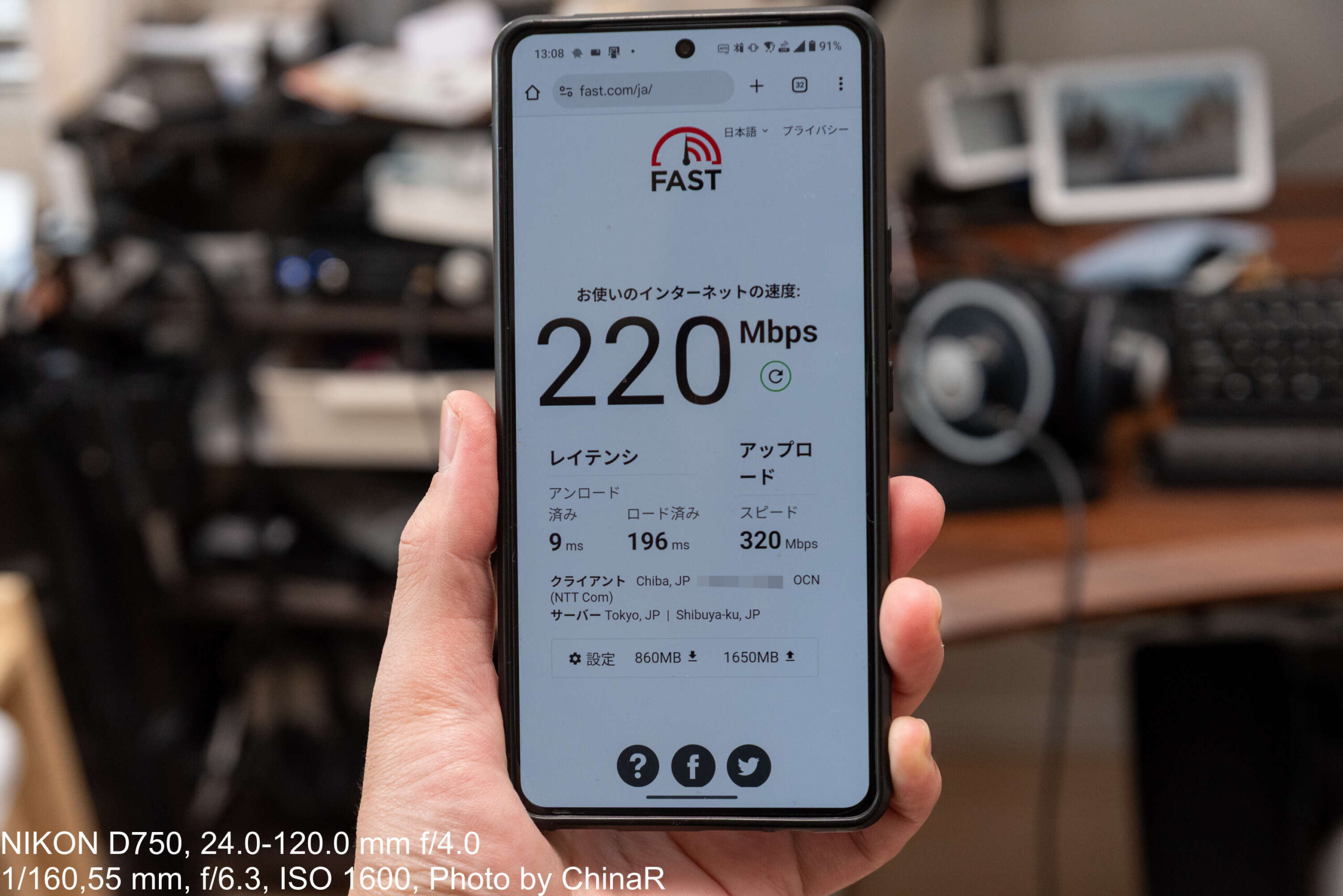 先程のルーターから近い部屋(左上の”メインベッドルーム”)での計測結果は220Mbps。レイテンシはWi-Fiルーターのためどうしてもレイテンシは出てしまうものの、アンロードの状態でのレイテンシは9msに抑えられているのでそれなりに快適な状態を確保している印象です。