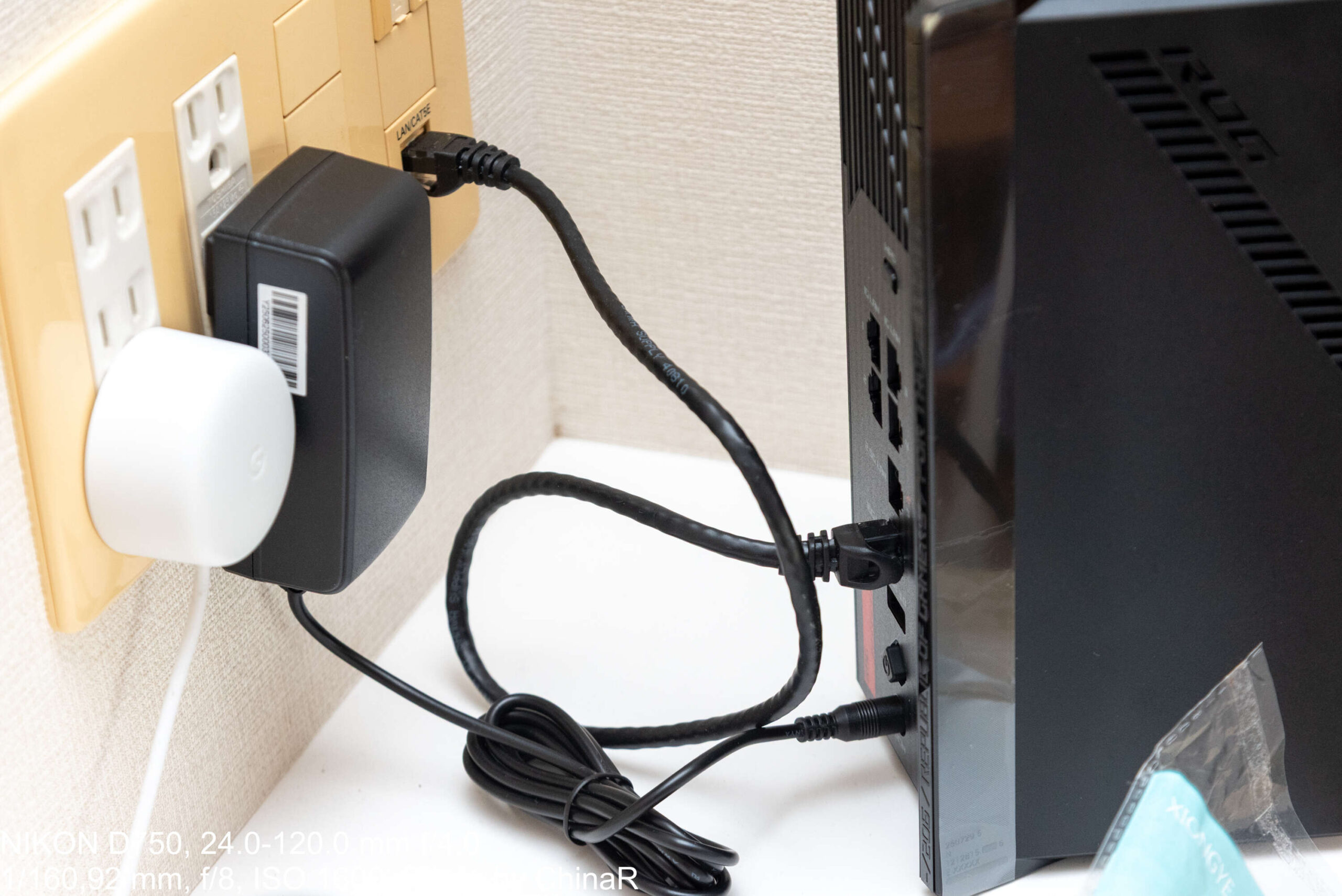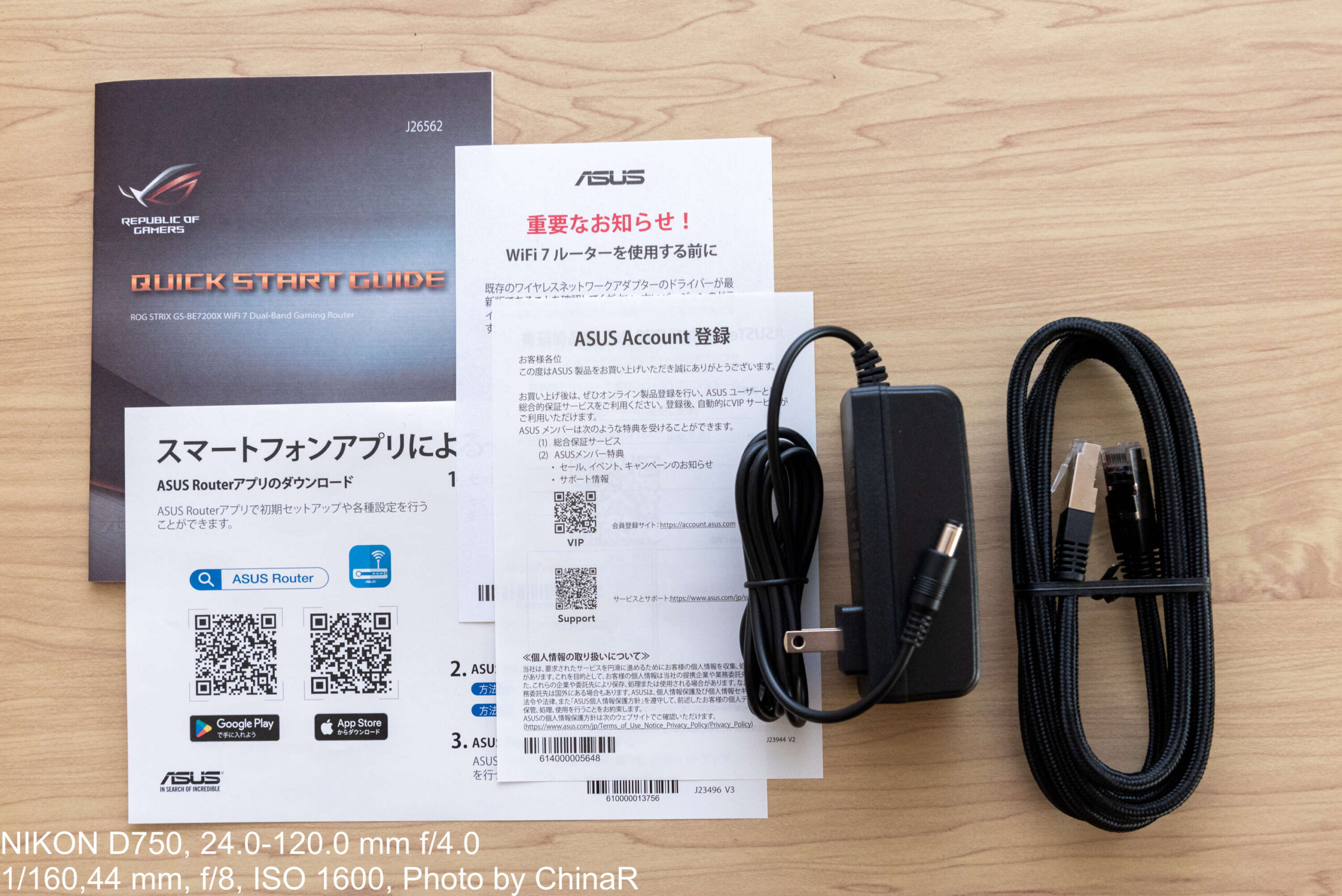 付属品はシンプルで、クイックスタートガイドとスマートフォンアプリでの設定方法、ASUS Accountの案内、そして電源アダプターとLANケーブルのみ。LANケーブルはCAT 6のものが付属していました。
