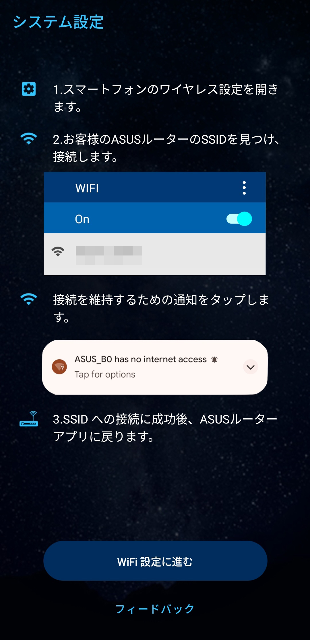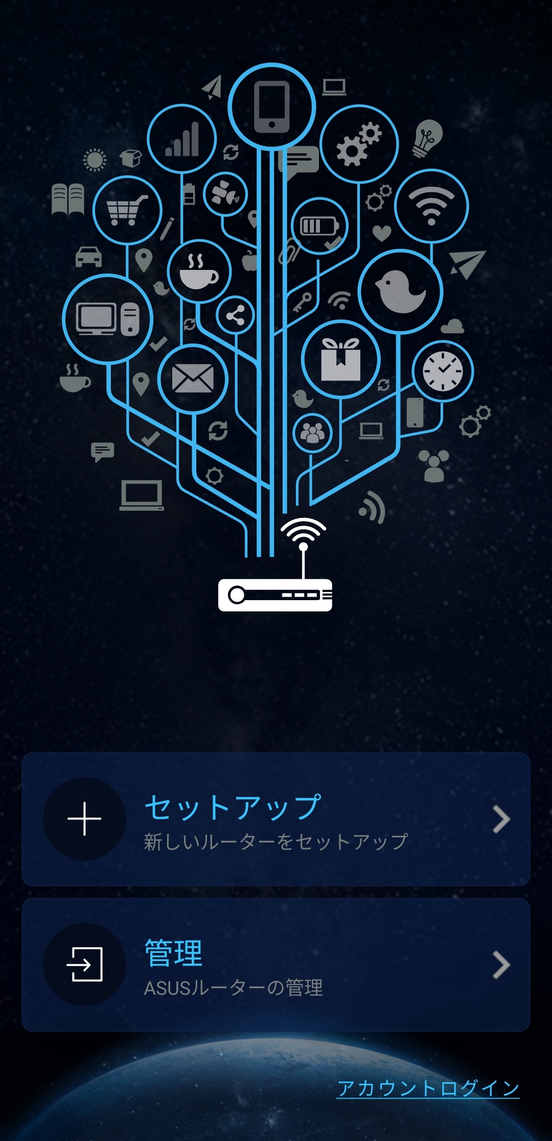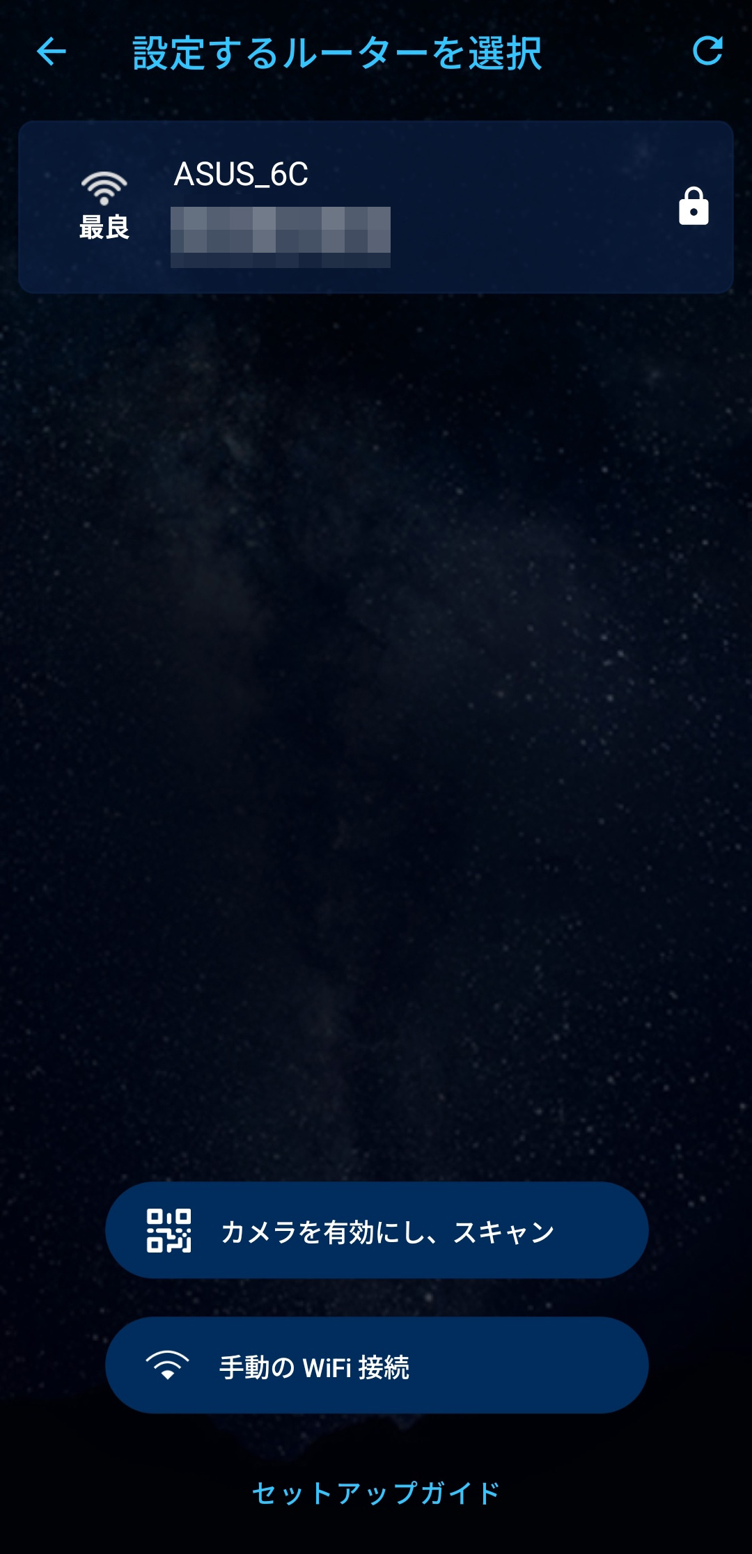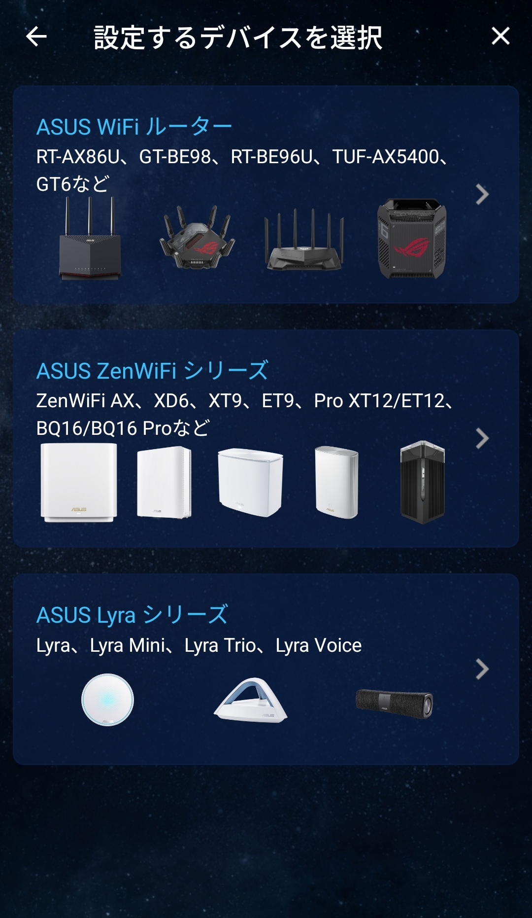 本機のセットアップにはASUS Routerアプリを利用。”新しいルーターのセットアップ”メニューから本機を選択していけば簡単にセットアップを始めていくことが可能です。