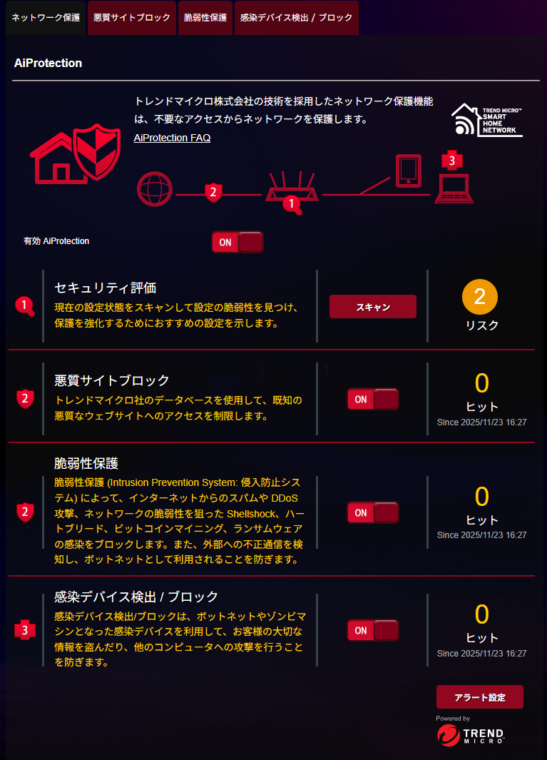 トレンドマイクロの技術を利用したネットワーク保護機能であるAiProtection機能も利用可能。悪質なサイトからの保護や、インターネット側からの不正検知のブロックを行う脆弱性保護機能、感染デバイス検出/ブロック機能といった高品質な保護技術を利用期間の縛りなしで無料で利用できるというもの。IoT機器の脆弱性をついてDDoS攻撃の踏み台にされるという事象も増えている今の時代には本機能は非常に便利な印象です。
