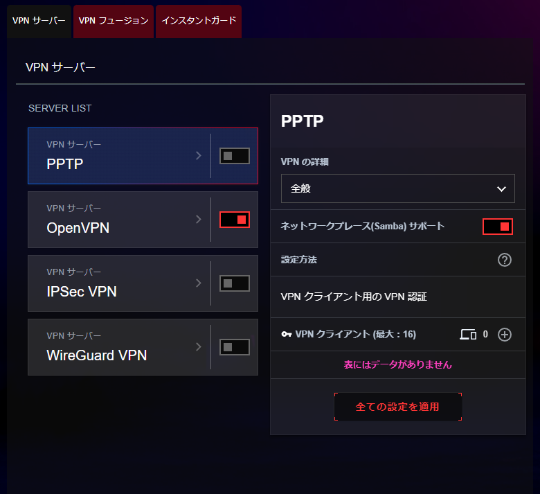 VPNVPN Client (L2TP/OVPN/PPTP/WireGuard), VPN Server (IPSec/OVPN/PPTP/WireGuard), VPN Fusion, Instant Guard