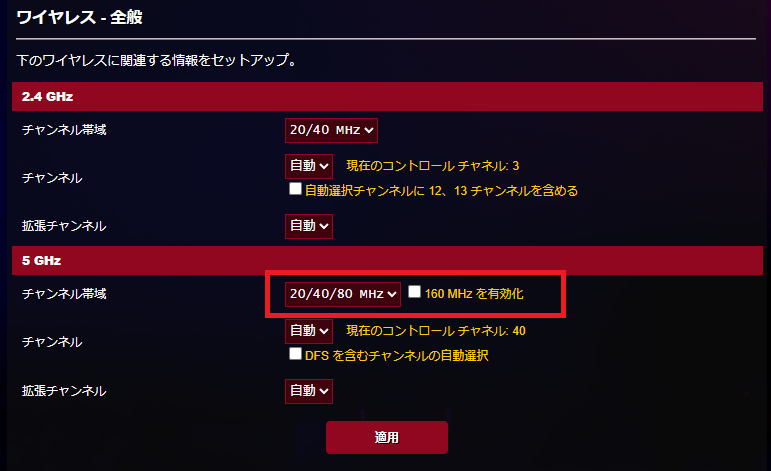 なお、私の家の環境では160MhzとDFSについてはOFFのほうが安定して利用できました。何が近くにあるのかは不明ですが、DFSを含むチャンネルを利用していたときには一定間隔でネットワークが切断されることがあり、OFFのほうが圧倒的に安定している印象です。