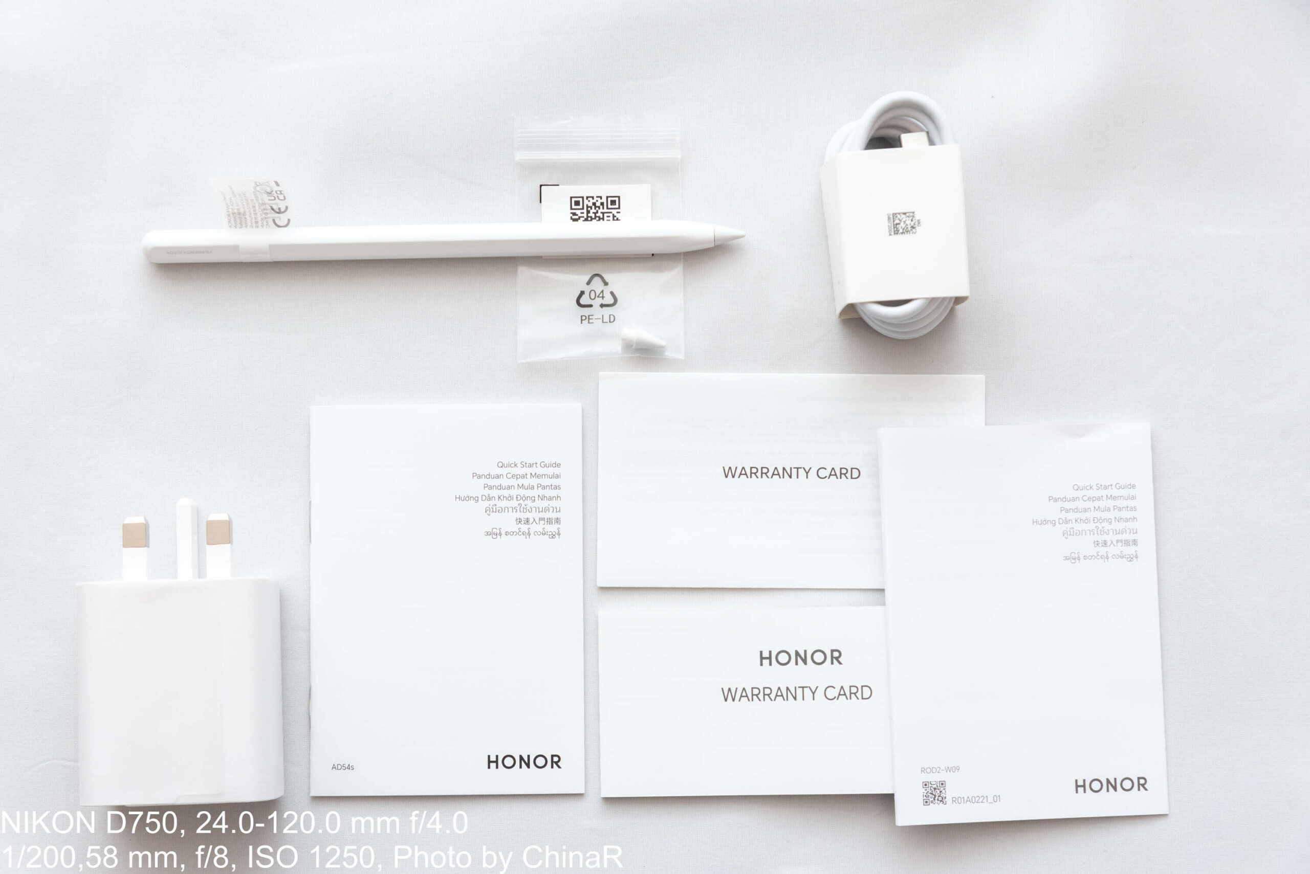 今回はキーボードカバー、スタイラスペンのHONOR Magic-Pencil 3とセットで購入。購入時はクーポンなどを組み合わせて最終的に6.5万円ほどで購入しており驚異的なコストパフォーマンスでした。同梱品とパッケージは写真のように電源アダプターと説明書や保証書、USB Type-A to Cケーブルといった感じ。電源アダプターはHONOR SuperCharge 66Wに対応したものでBFプラグ(イギリス)のものが付属していました。後述するようにUSB PDでも十分な充電速度のためわざわざ日本と同じUSプラグの充電器を別途購入する必要はあまりないかなと思います。