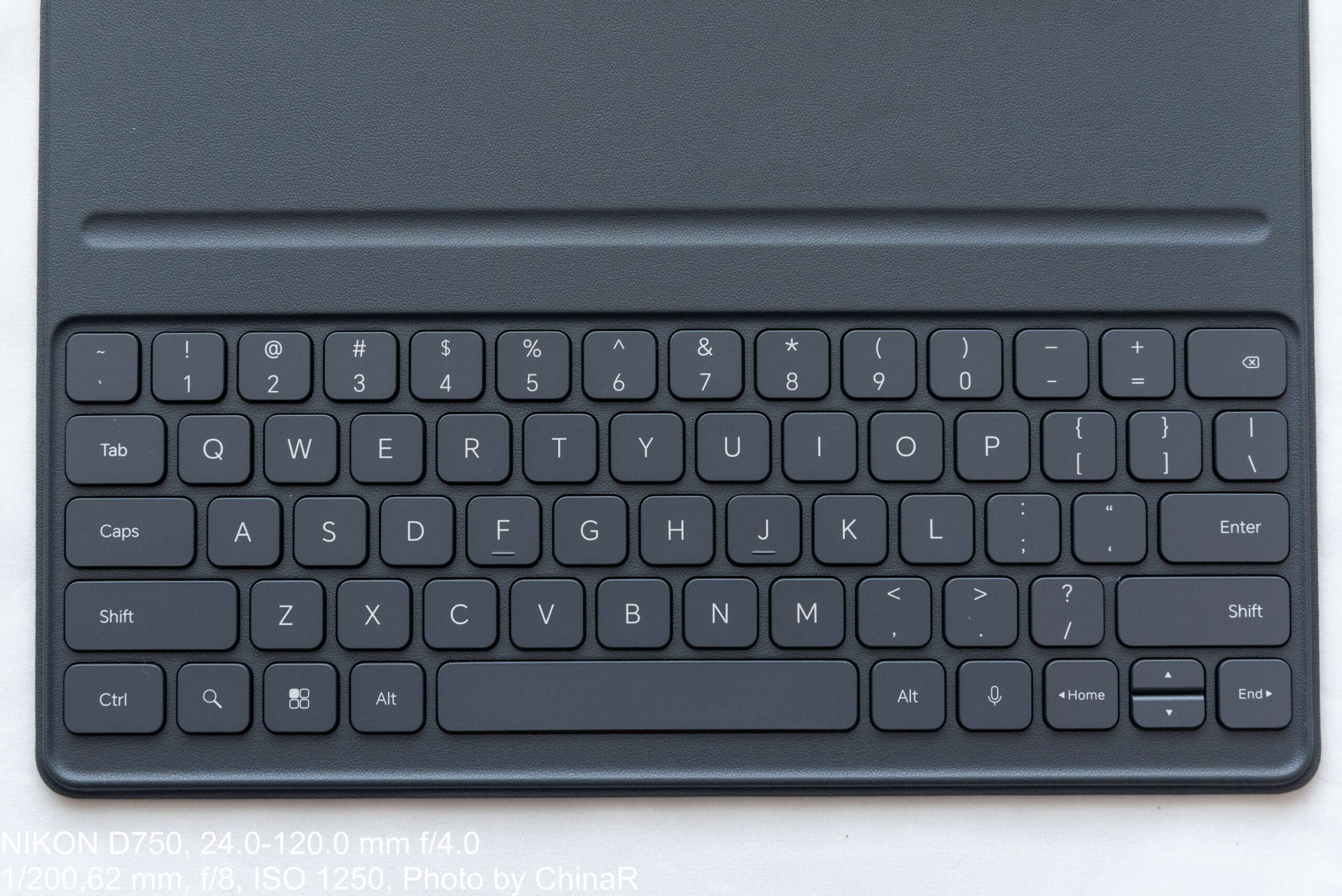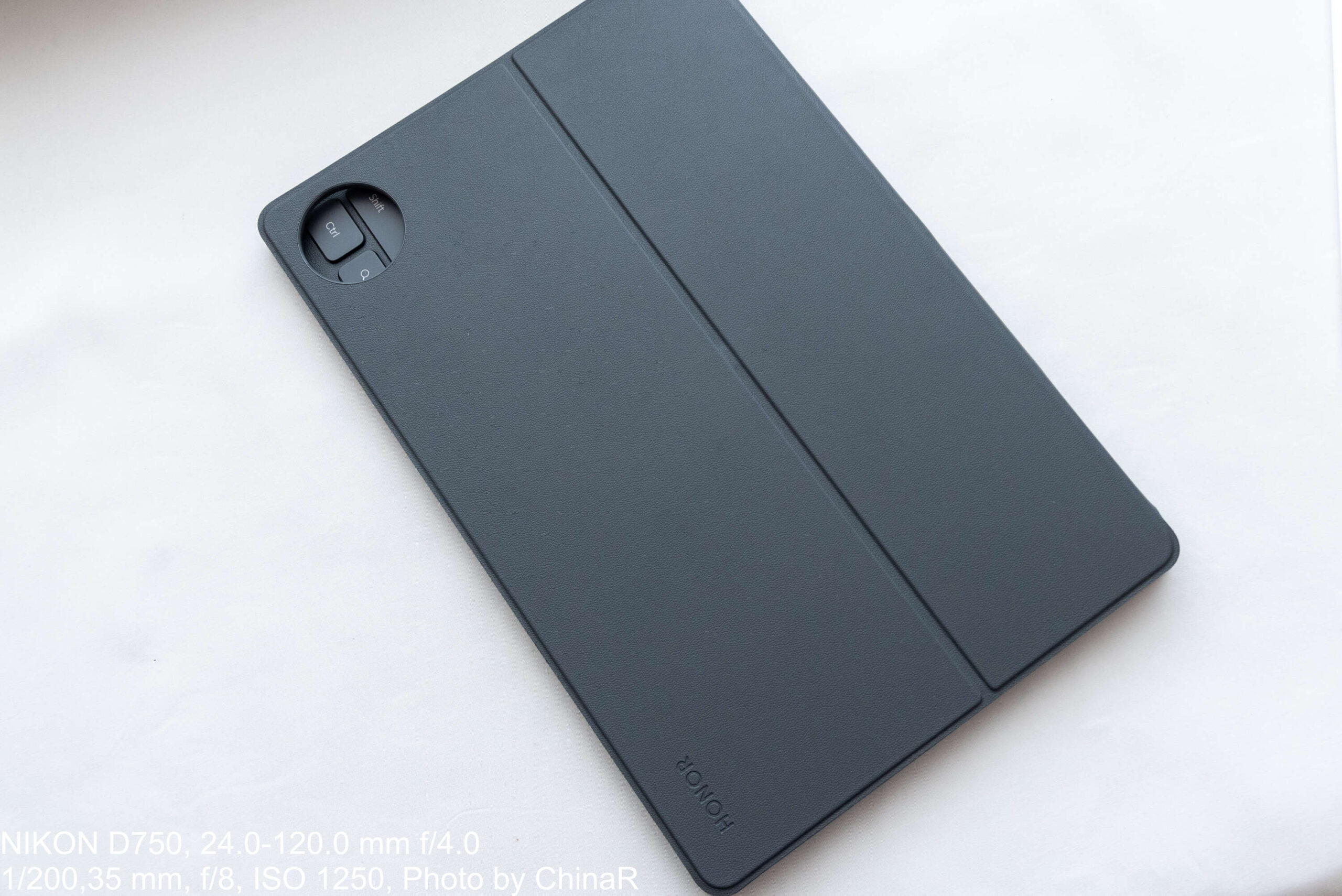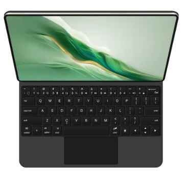 キーボードカバーを取り付けてみた様子がこちら。ケースの下の部分が折れ曲がるような形でスタンドになるデザインです。HONOR MagicPad 2とキーボード部分の接触はマグネットで固定されるようになっており、写真の状態で軽くタブレットを持ち上げてもキーボードと分離しないくらいの強度で固定されている感じ。電車内で膝上でキーボードを打つ、というのは厳しいものの机の上などでは安定感を確保した状態で使う事ができます。