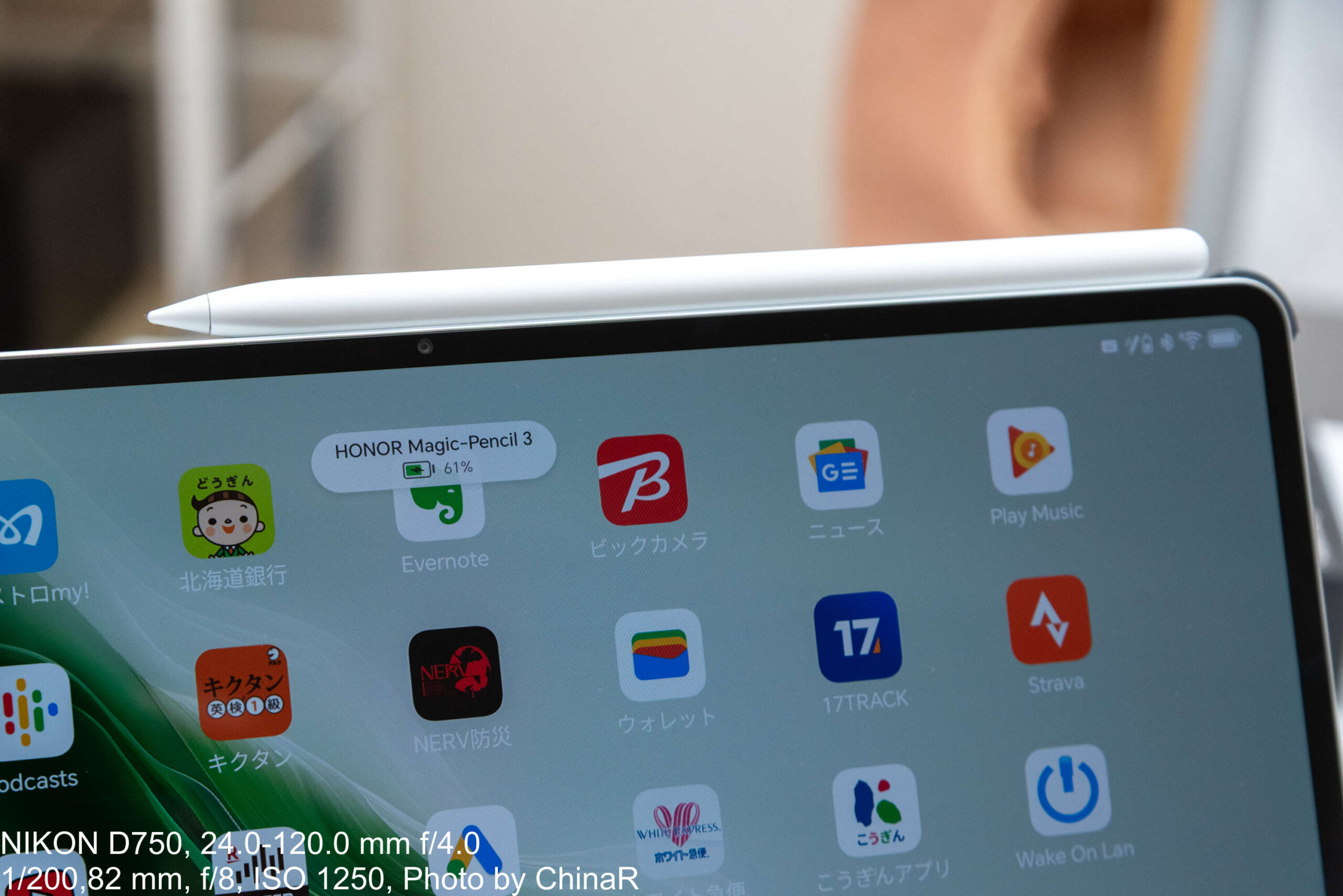 HONOR Magic-Pencil 3はボールペンと同じようなサイズ感。軽量で持ちやすくス握っている感覚も普通のペンと遜色ない印象です。バッテリーを内蔵していますが充電はHONOR MagicPad 2に取り付けることでワイヤレスで可能なため充電端子などは搭載していません。MagicPad 2に取り付けた際には、写真のようにMagic-Pencil 3の充電状況が表示されて簡単に確認できるようになります。