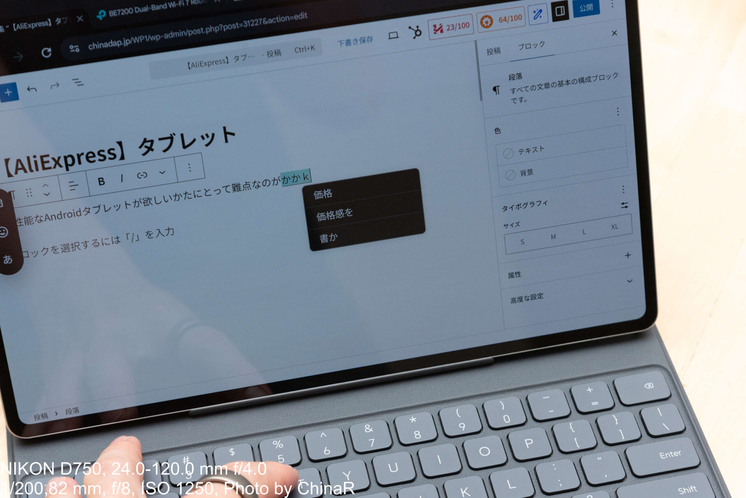 大画面のAndroidタブレットで試したいことといえば、ブログの執筆やドキュメントの編集。純正のキーボードもセットになっているため、別売品を買う必要なくキーボード付きのタブレットとして使い倒す事が可能です。キーボードと本体は物理的な端子ではなくBluetoothで接続。ペアリング操作は初回接続時に自動で行ってくれるためBluetooth接続であることを意識せずに接続することができました。
