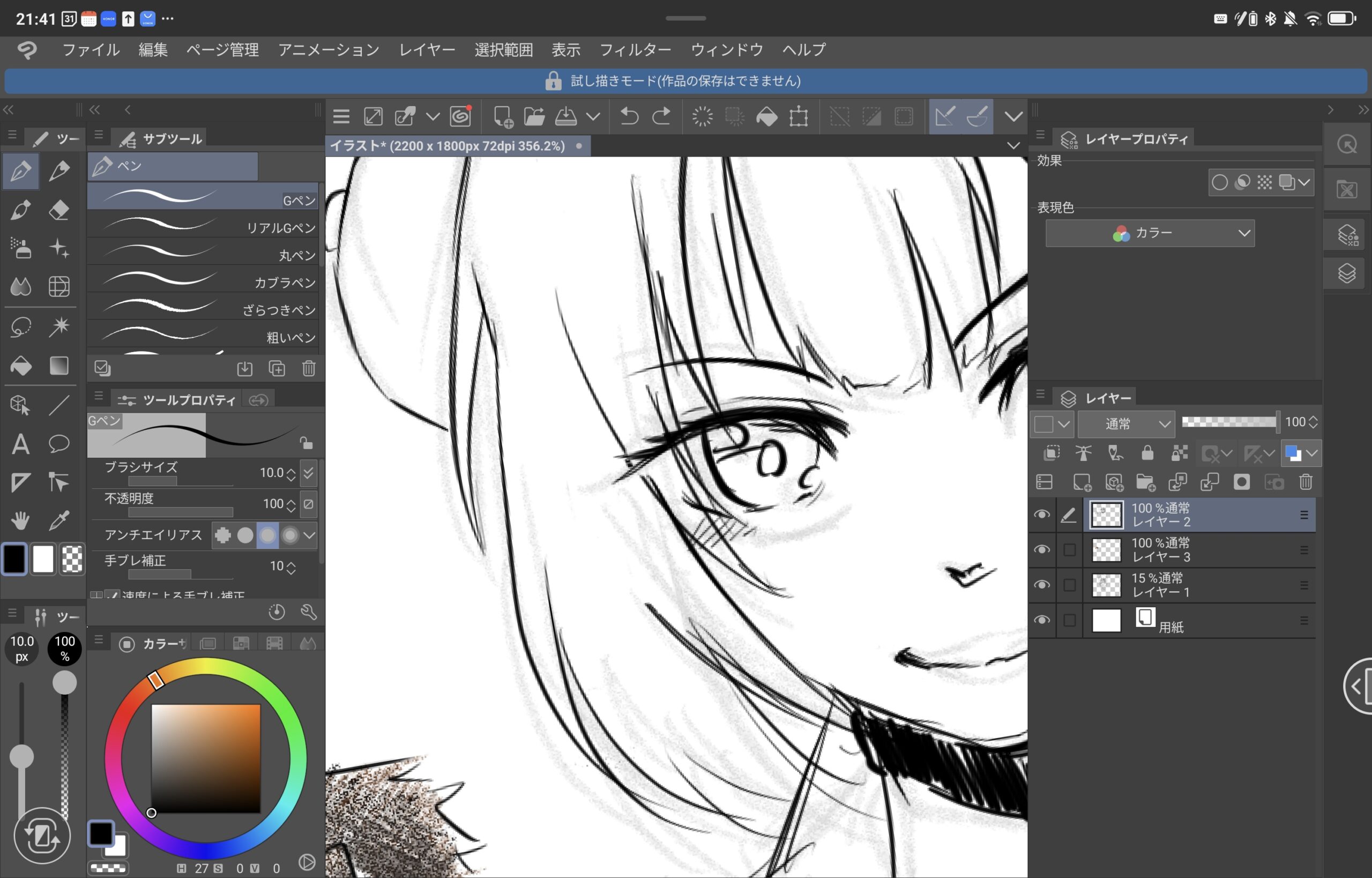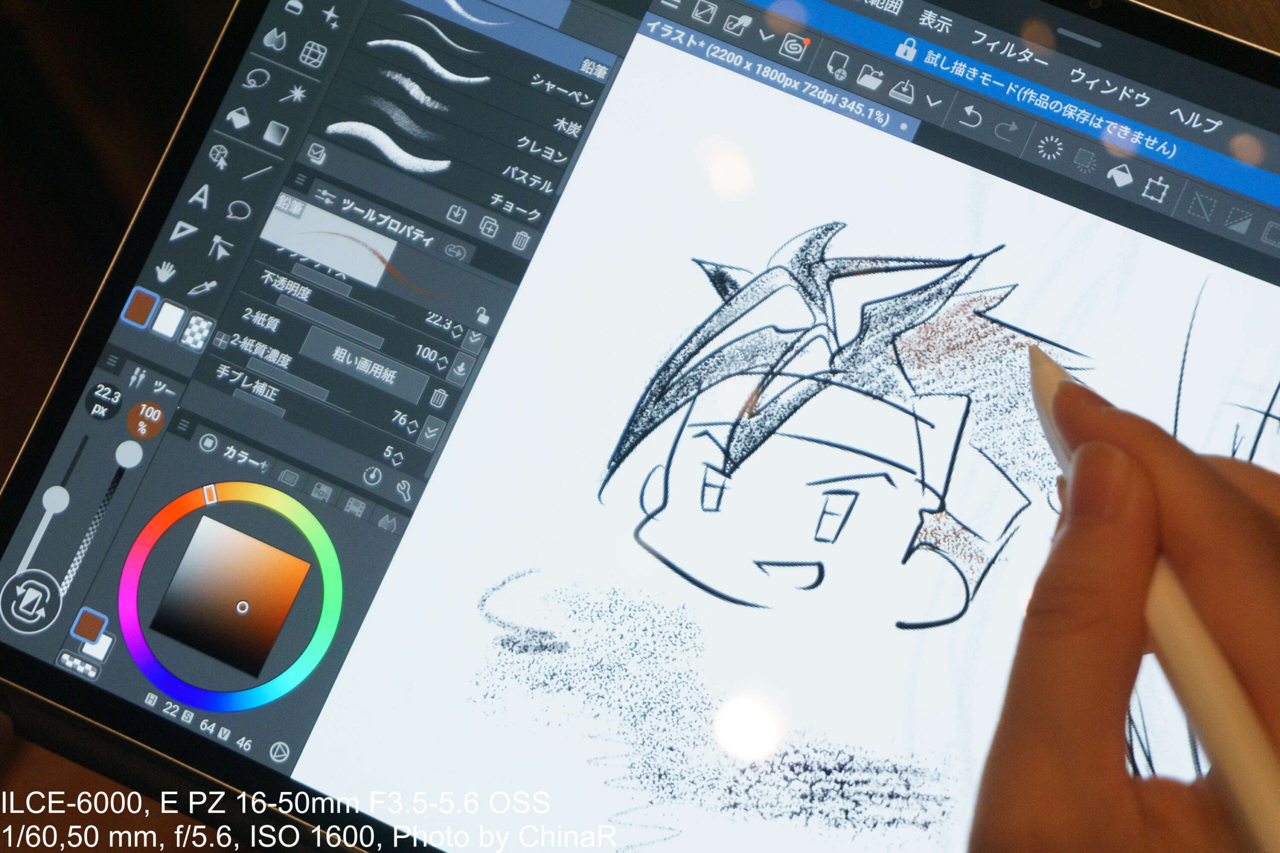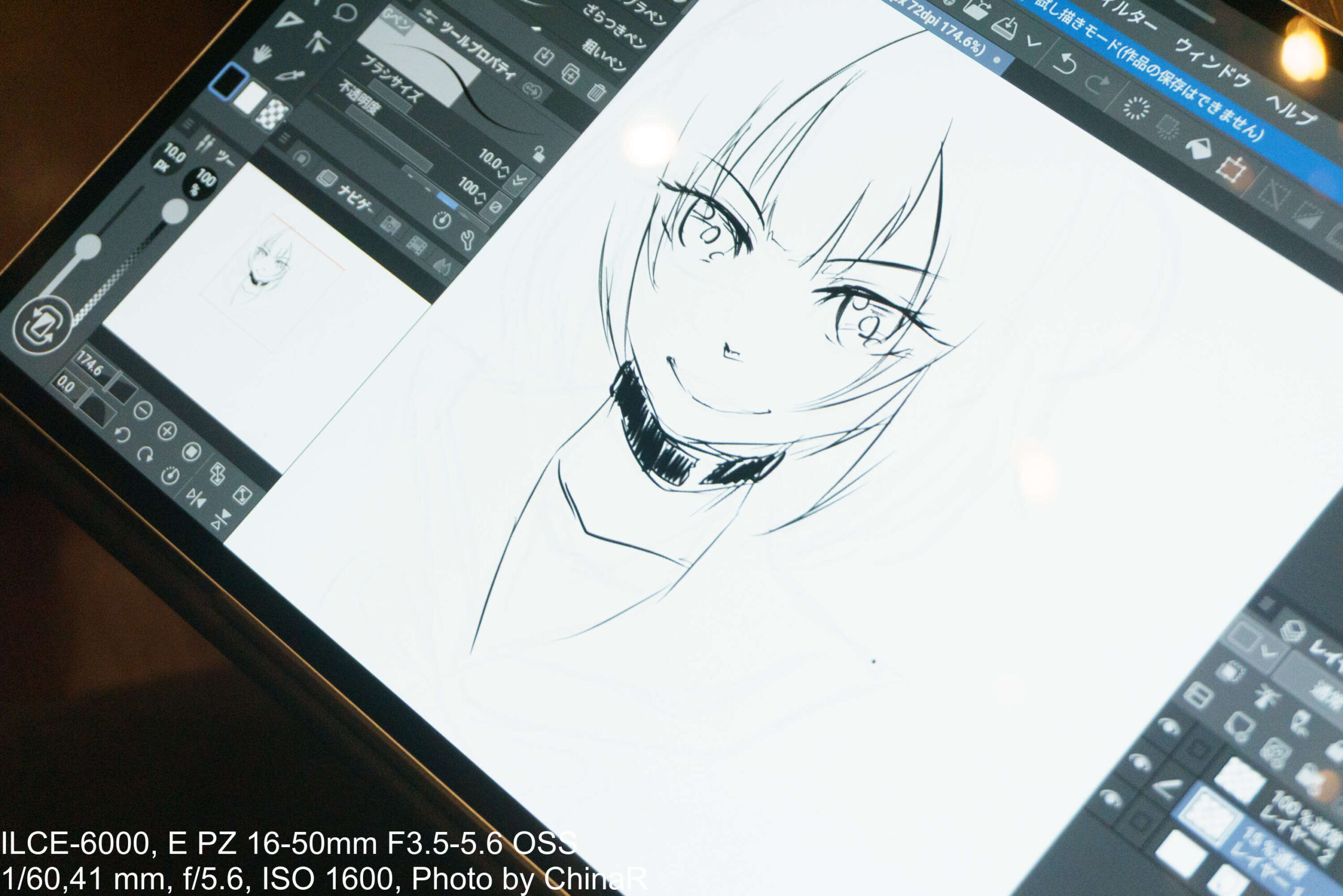 遅延の少なさも本ペンの大きな特徴。公称値では2msの低遅延を実現しているとされており、実際にCLIP STUDIO PAINTを使用して描画テストを行ったところ、ペン先の動きと画面上の描画の間にほとんどズレを感じることなく、紙に描いているような自然な感覚で作業できました。また。ペン先の精度も高く、画面上の狙った位置に正確に線を引くことができます。0圧での描画開始にも対応しており、ペンを画面に触れた瞬間から線が描き始められる仕様は、細かい描写を行う際に非常に便利です。傾き検知にも対応しており、ペンを寝かせた状態で描画すると線の太さが変化するなど、アナログの描画ツールに近い表現が可能になっています。