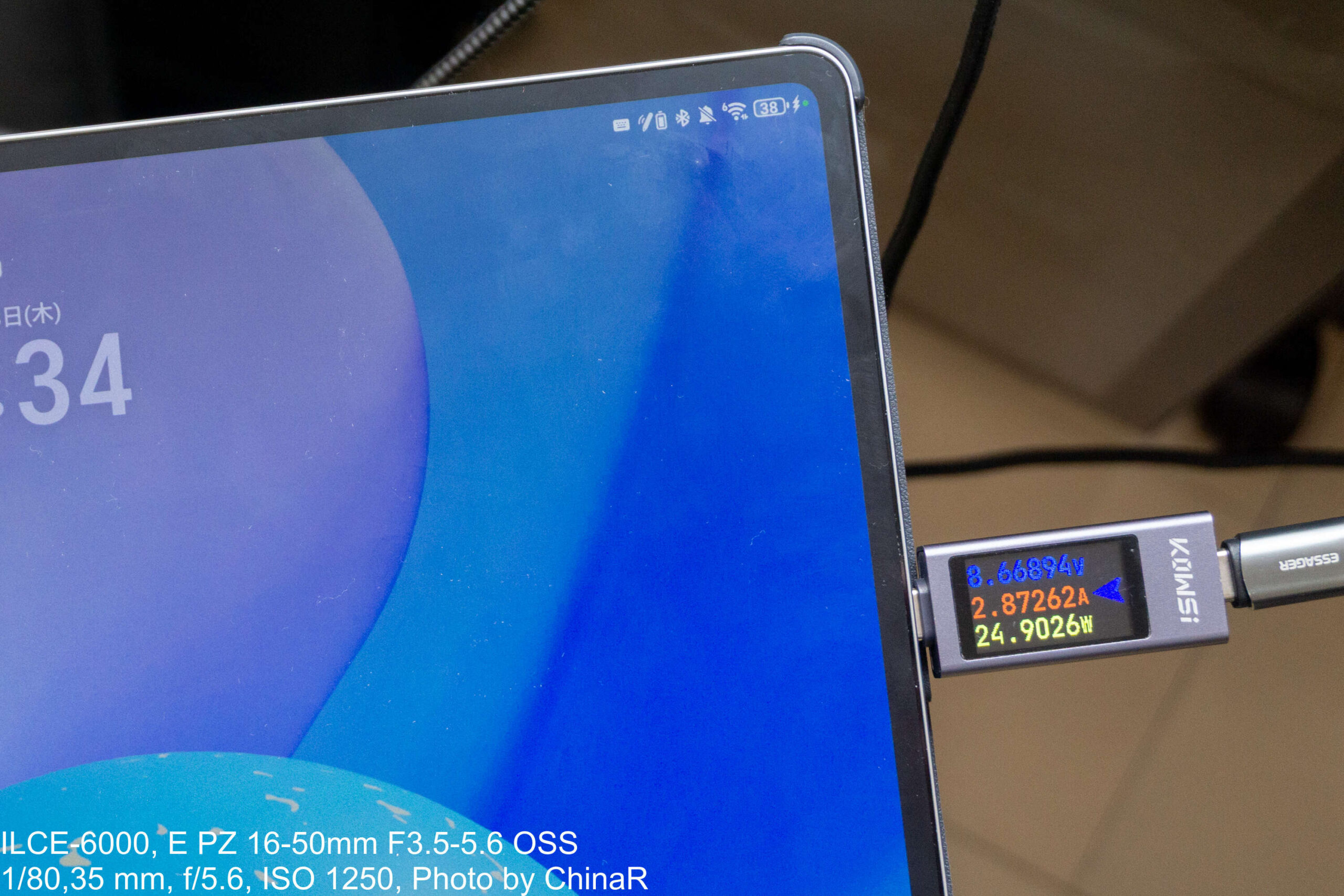 66W急速充電に対応している点も本製品の特徴で、USB PD対応の充電器を使用すれば短時間でバッテリーを満充電にすることが可能です。USB PDの場合は66W充電は利用できず25Wほどで給電される様子。0%まで利用した状態で充電を試したところ1時間50分ほどで100%まで充電することができました。実際には完全にバッテリーを空にすることは少なく、継ぎ足しながら使うことを考えればこの速度は十分という感じです。