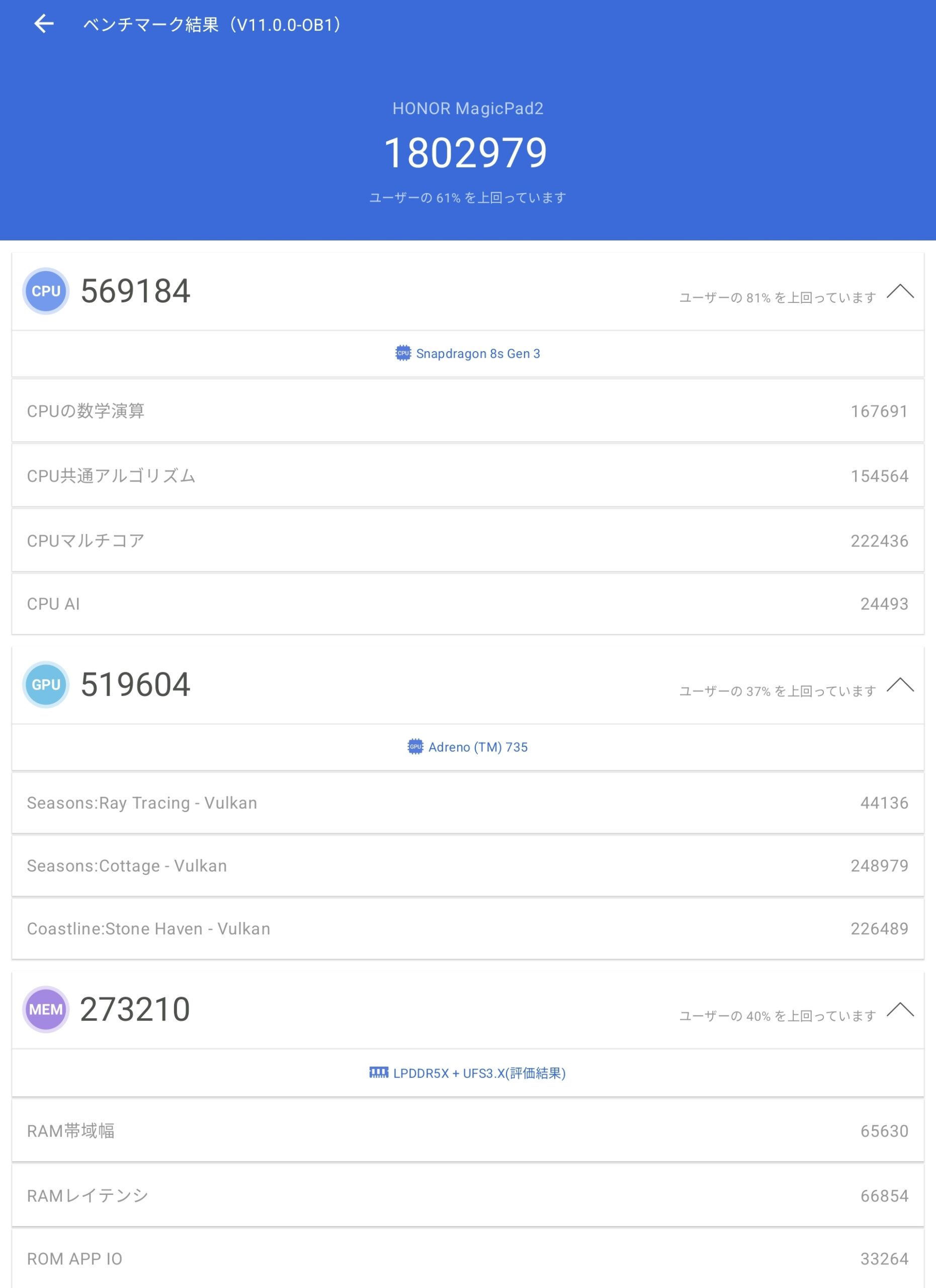HONOR MagicPad2の実際の性能をAntutuベンチマーク(V11.0.0)で測定したところ、総合スコア1,802,979点という結果に。内訳はCPUスコア569,184点、GPUスコア519,604点、MEMスコア273,210点、UXスコア440,981点でした。180万点を超えるスコアは、タブレットとしては非常に高いレベルで、今年レビューしたミドルハイスマートフォンのPOCO F7(Qualcomm Snapdragon 8s Gen4)と同等レベルのスコアでした。