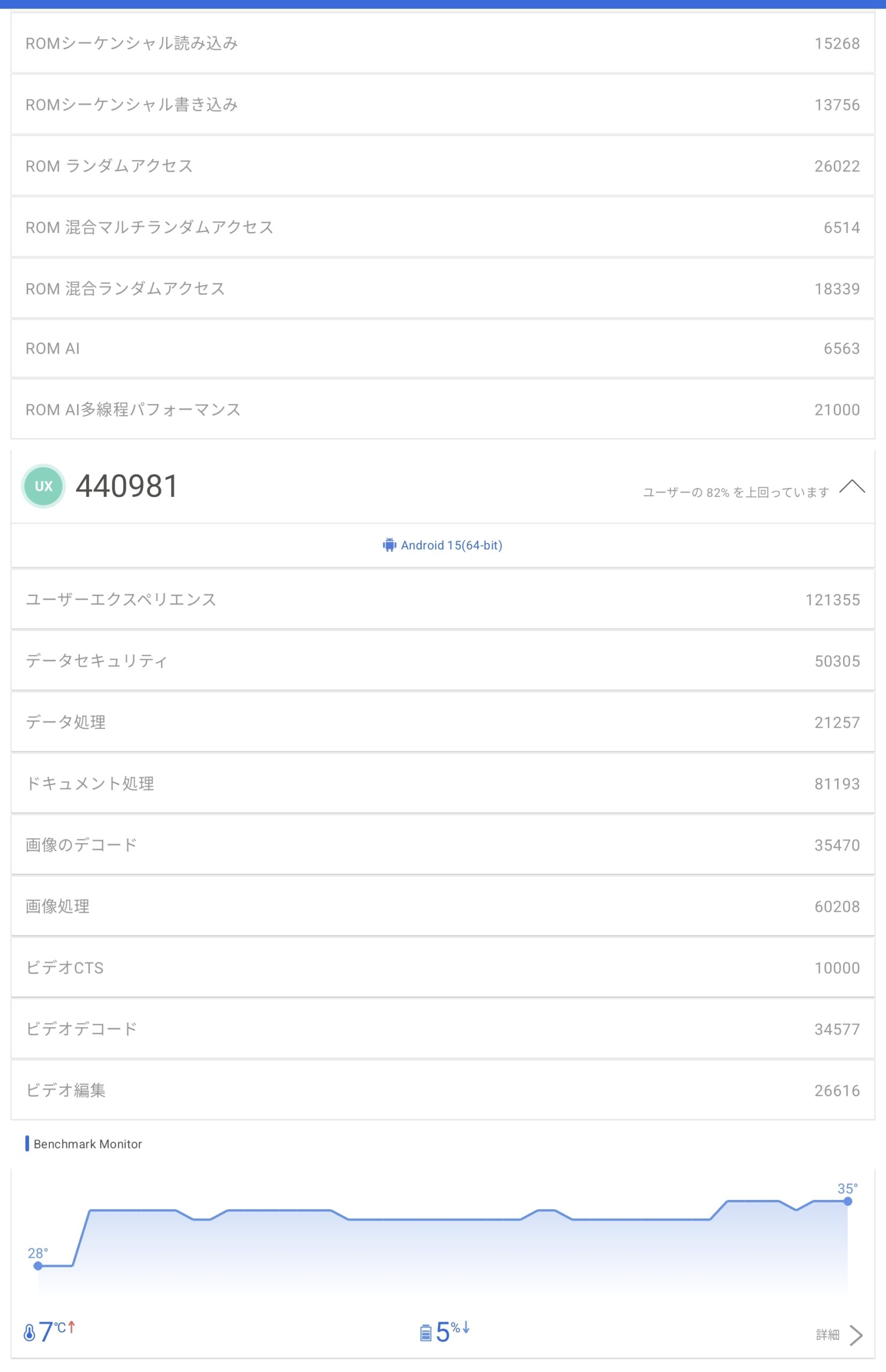 ベンチマーク実行中の温度管理も優秀で、テスト開始時28℃から最高35℃までの上昇に抑えられており、発熱制御が適切に機能していることが確認できました。バッテリー消費も5%程度と少なく、高負荷時でも効率的な電力管理が行われている印象です。長時間のゲームプレイやクリエイティブ作業においても快適に使い続けられる事がわかるかと。