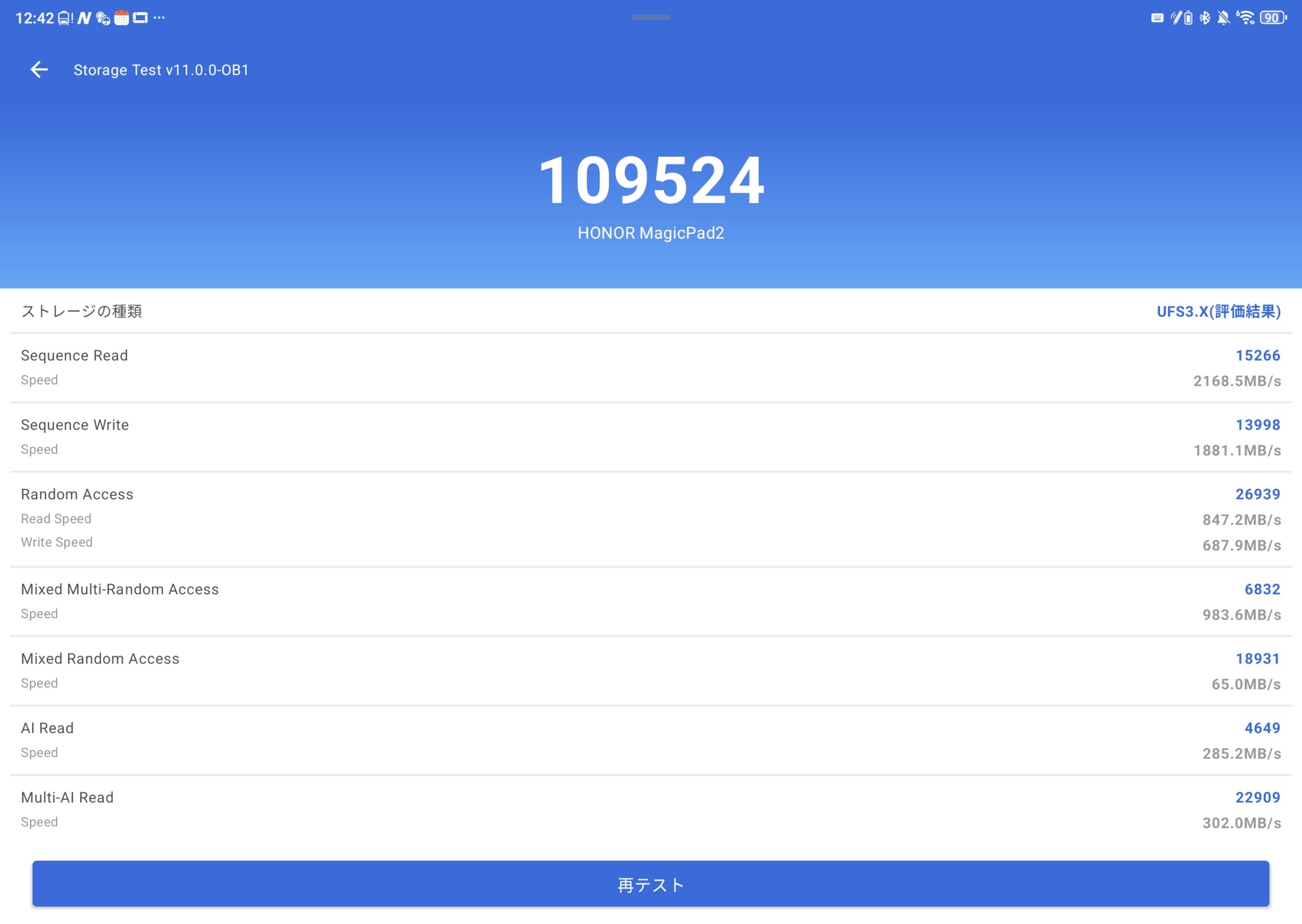 ストレージ性能をAntutu Storage Test(V11.0.0)で測定。シーケンシャルリードは2,168.5MB/s、シーケンシャルライトは1,881.1MB/sを記録し、大容量ファイルの転送でも高速に転送できることを確認。ランダムアクセスはリード847.2MB/s、ライト687.9MB/sで、アプリの動作速度やシステム全体のレスポンスの面でも十分な速度を確保。混合マルチランダムアクセスは983.6MB/s、混合ランダムアクセスは302.0MB/sを記録し、マルチタスク環境でも快適に使用できる実力です。