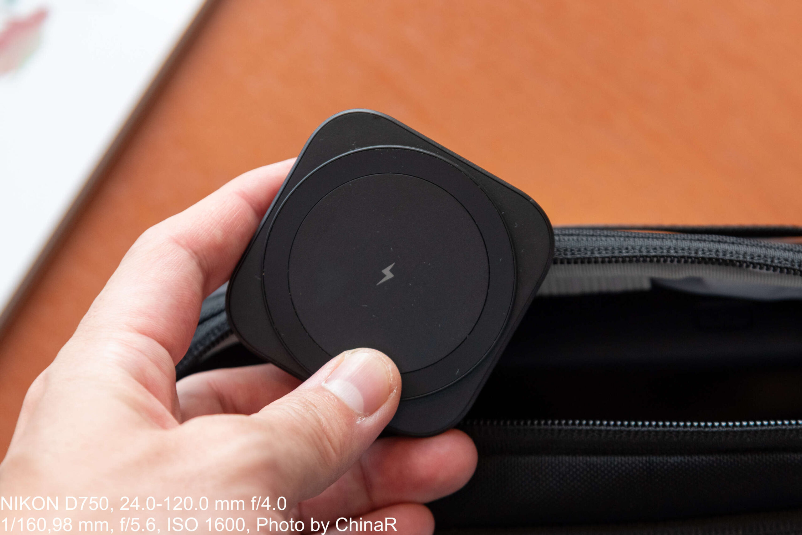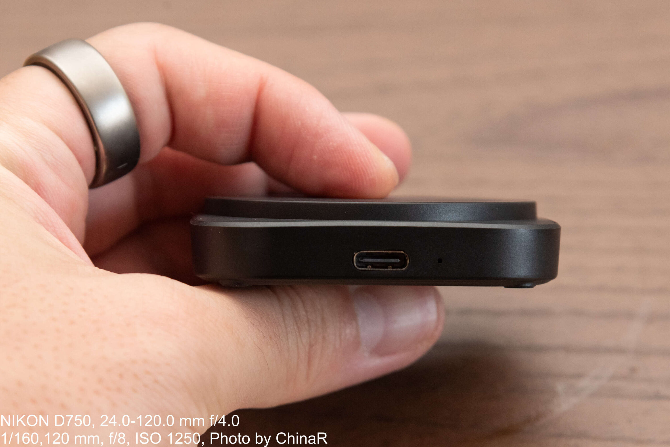 本体は非常に薄型軽量なデザイン。指先でつまめるようなサイズで、手のひらには余裕で収まる小ささになっています。本体全面がちょうどMagSafeのマグネットがぴったり入るようになっており、限界まで小さくしたような大きさです。裏側を見ると腕時計のマークがある場所も。この腕時計マークについては後述します。入力口はUSB Type-C端子を一つ備えます。