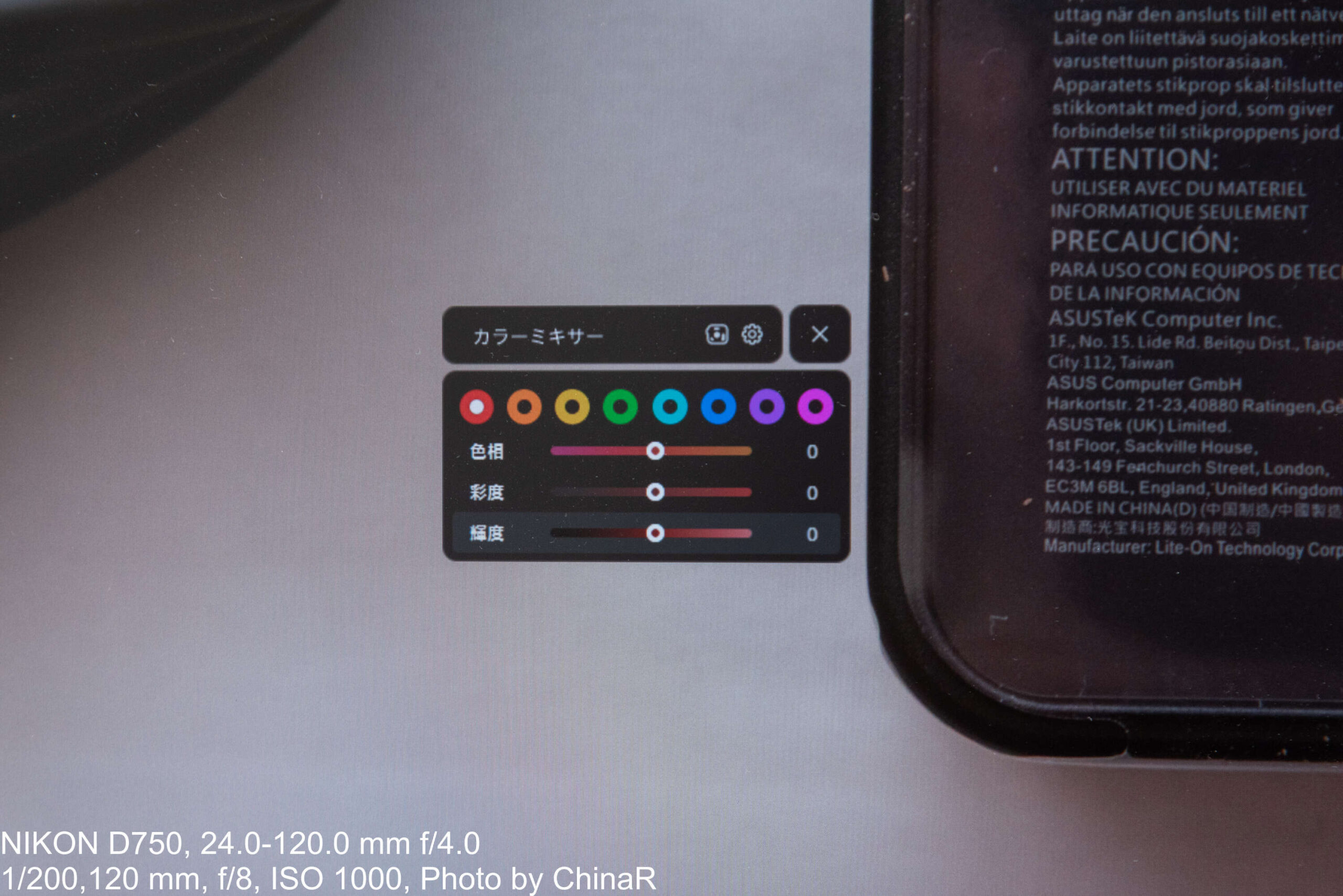 カラーミキサーに関しても完璧に呼び出すことが可能。操作したい色を選択肢、その色相、彩度、輝度を自由に調整することで好みの色に簡単に調整することができます。通常はこの作業は画面の右側に表示されるサイドバーをにらめっこするものですが、TourBox Elite Plusのダイナミックパネルなら操作したいと思う内容だけを表示して操作できるので非常に便利というわけでした。