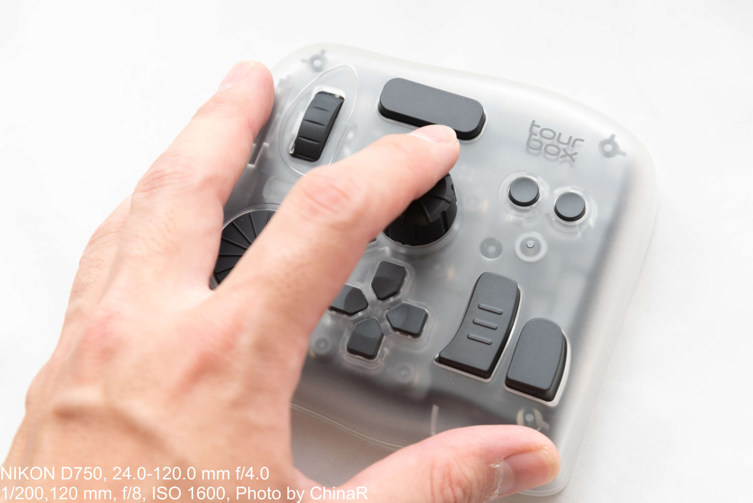 Tourboxシリーズのデザインは過去のモデルも踏まえて洗練されており、ちょうど左手を置くとメインのノブに人差し指を持っていけるようなデザインに。左側のトールキー、ショートキーには親指が、サイドキーには薬指がというように左手の各指をフルに利用して操作を行えるようになっています。