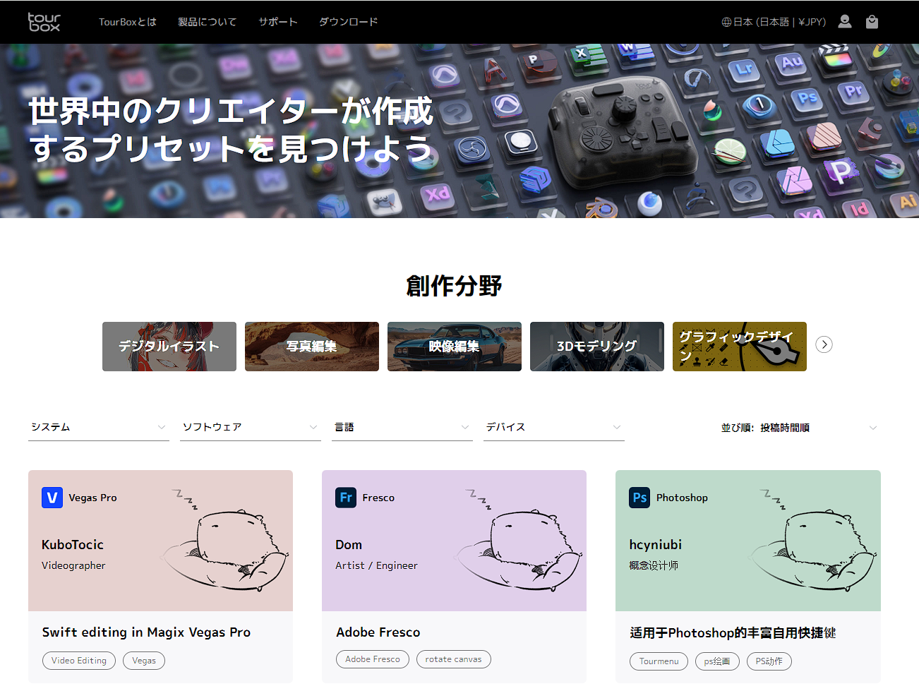 それ以外のソフトウェアに関してもTourBoxの公式サイト上に利用者がアップロードしたプリセットが用意。おこからダウンロードすることでMicrosoft Teams、OutlookといったオフィスソフトからAffinityシリーズ、Clip Studioまで幅広い製品のプリセットをダウンロードすることができます。