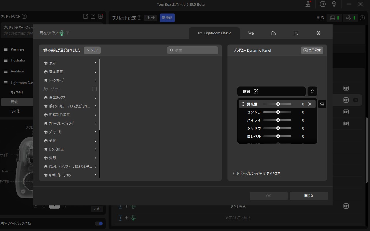 ショートカットキーの設定画面から、ダイナミックパネルについても設定が可能。これまではLightroomのショートカットを割り当てていただけですが、ダイナミックパネルではTourBoxコンソールが操作に介入する幅が広がり、これまででは操作できなかったトーンカーブなどもTourBox Elite Plusの操作だけで完結させることができるようになりました。パネルに何を表示して、どの操作を可能にするかも簡単に調整できるわけです。