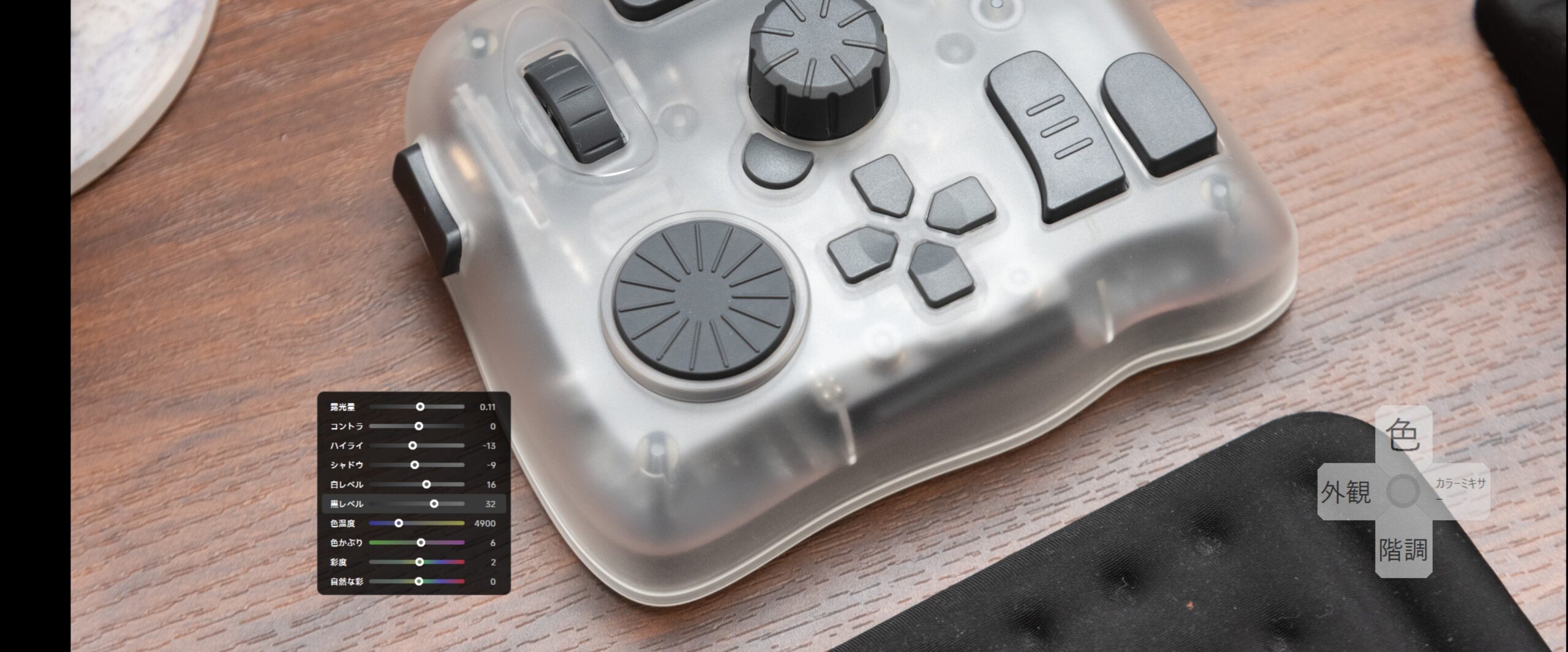 ダイナミックパネルの表示は、TourBox Elite Plusの十字キーを使って切り替えが可能。上下左右で4つのパネルを選択できるだけでなく、サイドキーやトップキーと十字キーを組み合わせることで更に多くのパネルを表示することも可能です。標準の上下左右で、階調、外観、色、カラーミキサーを割り当てて、サイドキーを組み合わせた際には角度調整や切り取りメニューも呼び出せるようにしてみました。