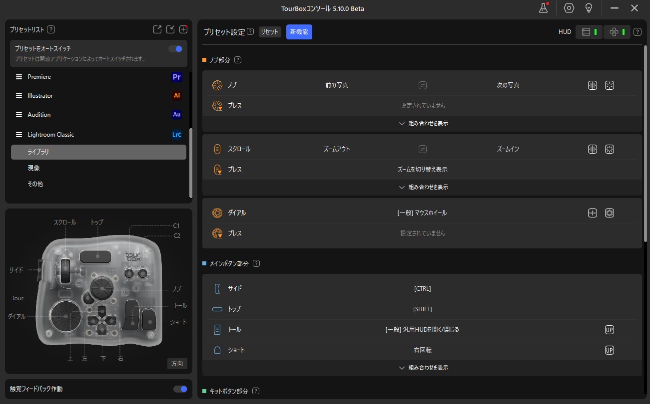 写真編集ソフトのAdobe LightroomなどでTourBox Elite Plusを利用するのに必要なのが純正ソフトであるTourBoxコンソール。各ボタンでの動作を調整したり、利用するソフトに応じて動作を変えるといったこともこのコンソール上から設定することが可能。よく使われるLightroomやAdobe Premiere Pro、Illustrator、Audition、Photoshopについてはボタンのプリセットが用意されており自身で設定することなく利用できるようになっています。
