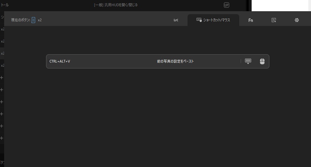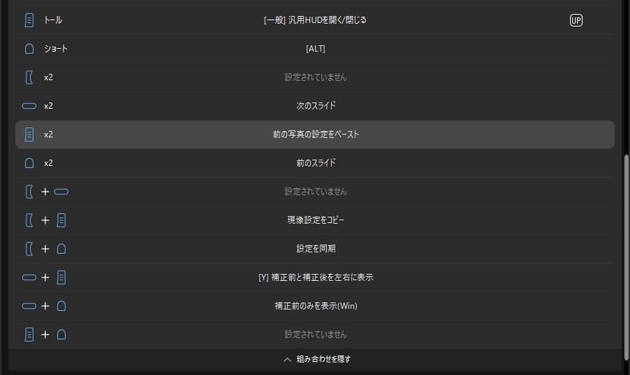 設定は非常に簡単。TourBoxコンソールをメインウインドウとして開いた状態で、TourBox Elite Plusのボタンを操作すれば、TourBoxコンソール上で操作したボタンの設定部分に遷移。あとは、その操作を何に割り当てたいかを選ぶだけです。”前の写真の設定をペースト”の場合は、ショートカットの一覧を見ながら選べば問題なく設定できました。
