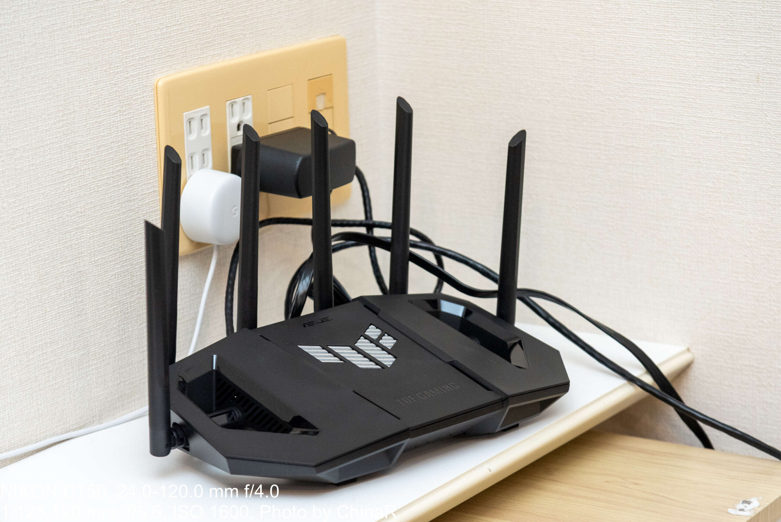 私が以前使っていたのはASUS ROG Strix GS-BE7200X(WiFi 6E対応)でした。こちらは縦置きが可能だったため、設置スペースをあまり取らなかったのですが、TUF Gaming BE9400は横置き専用。サイズは320×179×191mmということで、正直なところ場所は取ります。我が家ではリビング側のカウンターキッチン端にあるVDSL接続のインターネット回線集約地点に設置しているため、設置場所自体は簡単に決められましたが、スペースに余裕がない環境だと少し困るかもしれません。