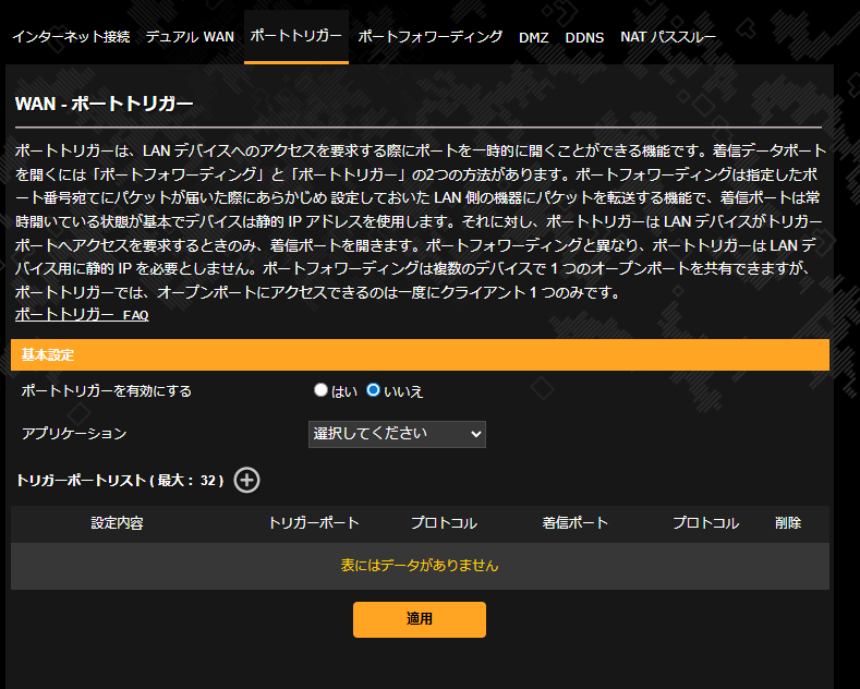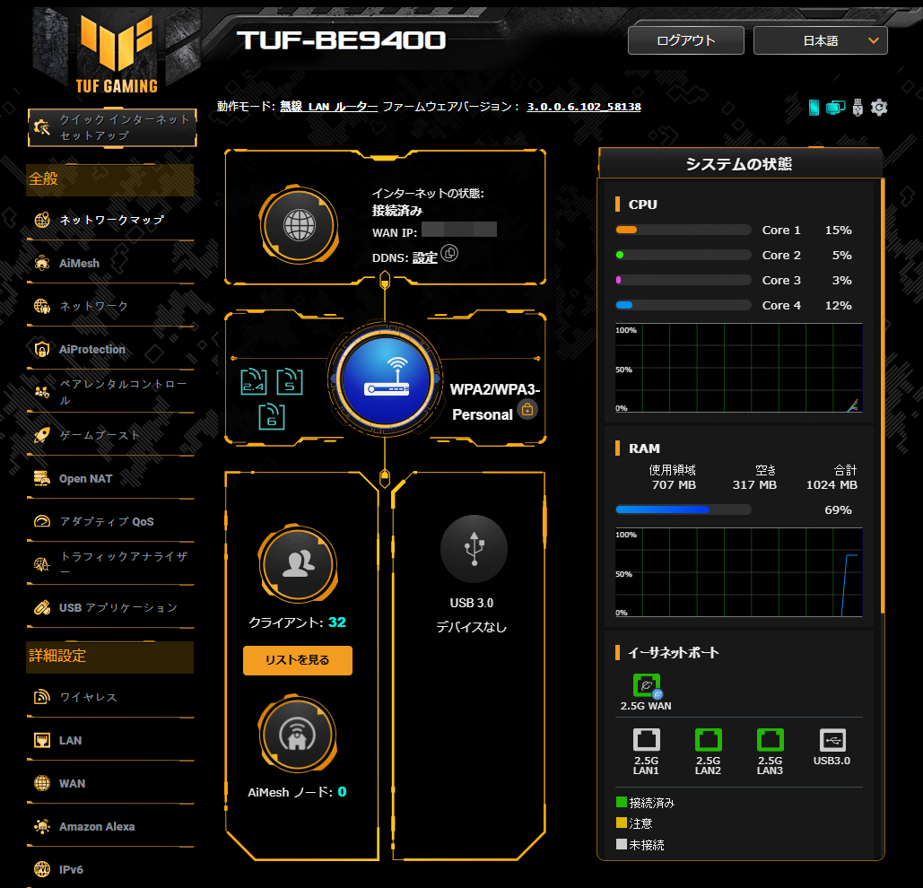 | ポート | WAN: 2.5Gbps×1、LAN: 2.5Gbps×3(うち1つはゲーム専用ポート)、USB 3.2 Gen1×1 |