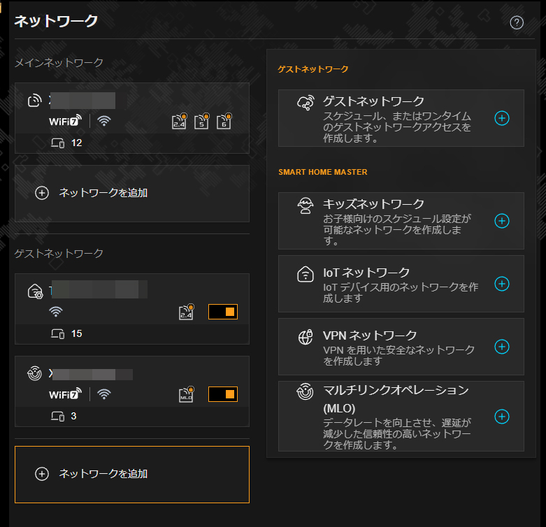 最終的に、通常SSID(トライバンド)は一般的なデバイス用、IoTネットワーク(2.4GHzのみ)はスマートホーム機器30台以上用、MLOネットワークはZenfone 12 UltraとデスクトップPC+α用という構成にしました。IoTネットワークを2.4GHzのみに設定したのは、スマートホーム機器の多くが2.4GHzにしか対応していないことと、安定性を優先したかったため。