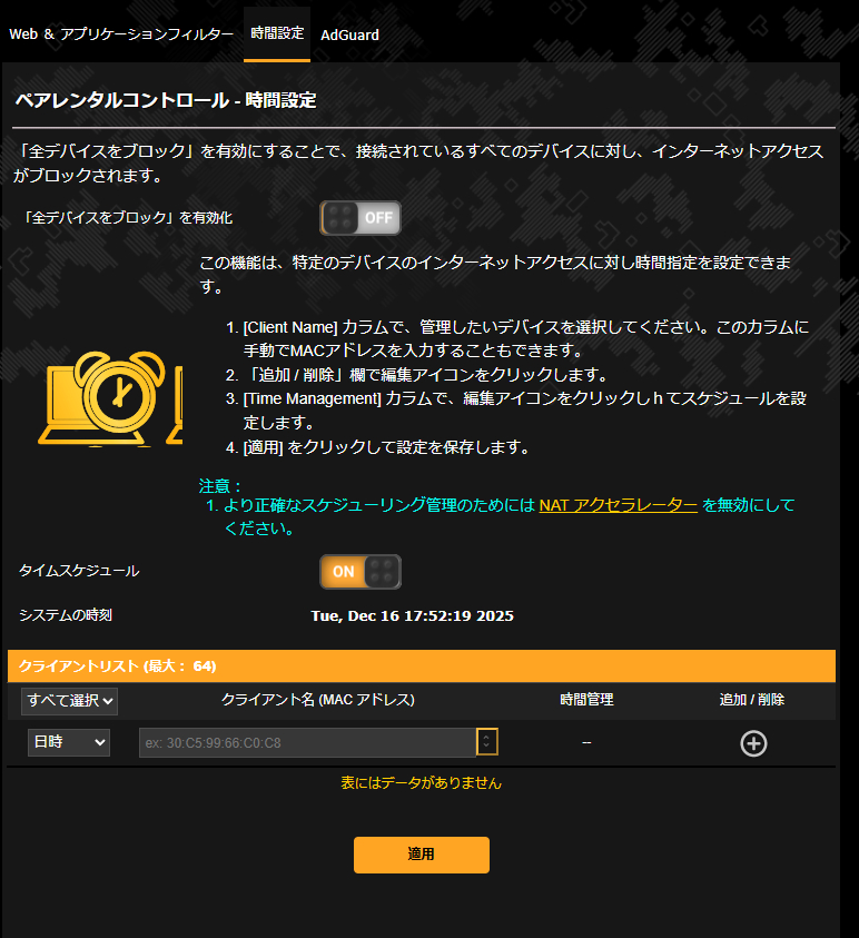 設定を変更するたびにWiFiネットワークが一度切断されるため、30台以上のデバイスが接続されている環境では1つの設定変更に2分近くかかることもあり、結局全部で1時間ほどかかりました。この仕様は以前使っていたTP-Linkのルーターとは異なるため、今後のファームウェアアップデートで改善を期待したいところです。