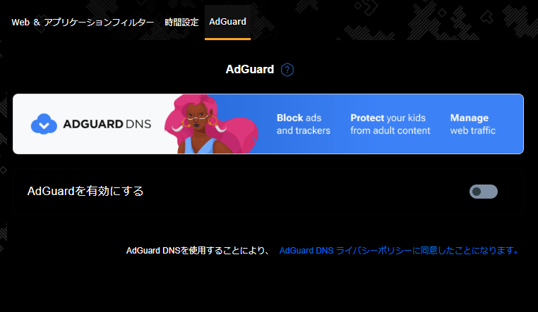 個人的に嬉しかったのが、AdGuard DNSに対応していること。これを有効にすることで、ネットワーク全体で広告ブロックやトラッキング防止が可能になります。各デバイスに個別に広告ブロッカーを入れる手間が省けるのは非常に便利です。