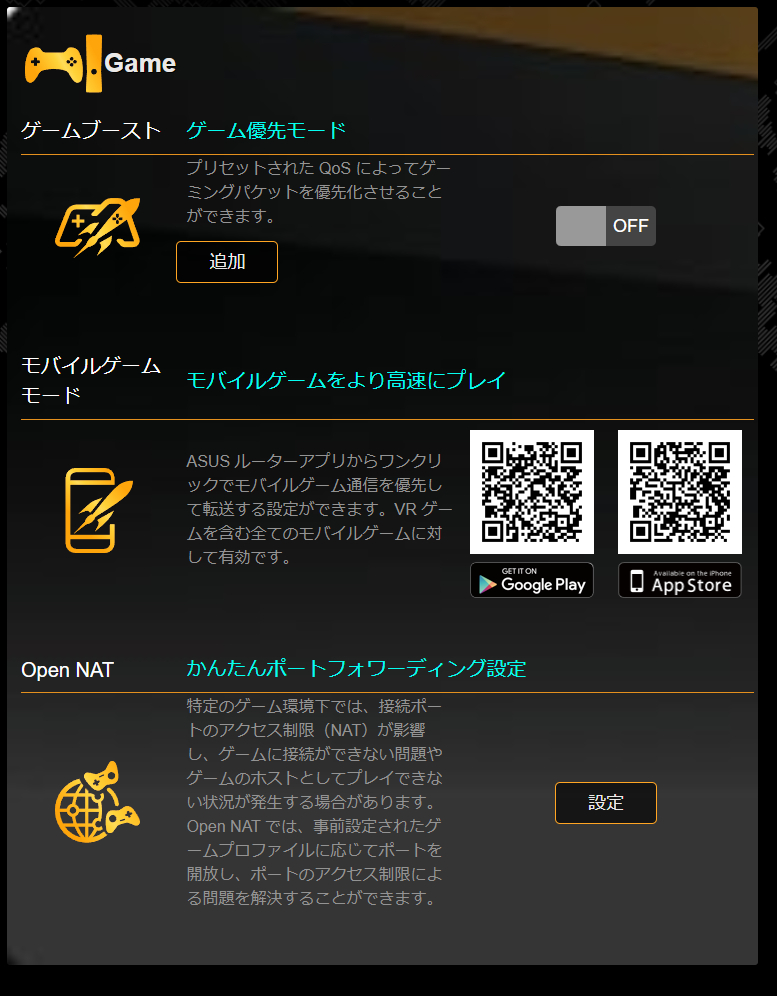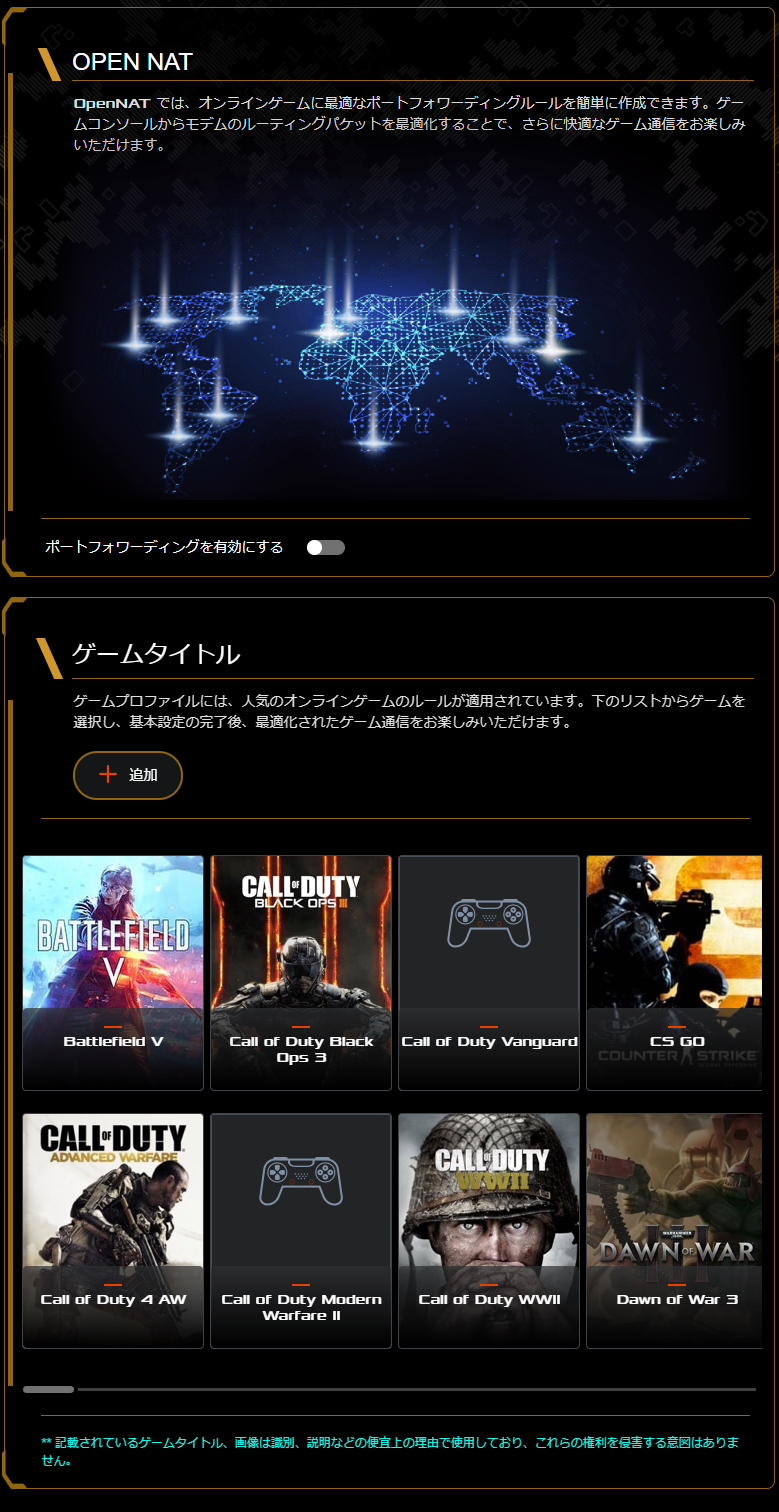 ゲームTurbo機能でゲーミングデバイスのトラフィックを自動優先化。3段階の優先度設定も可能