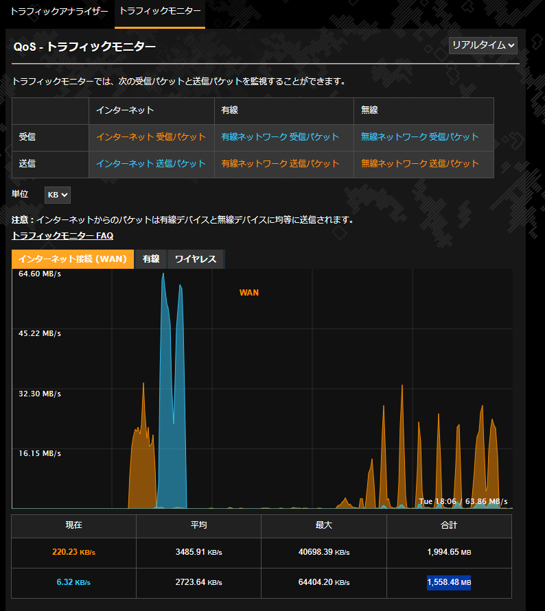 トラフィックモニターでは、リアルタイムでWAN、有線、ワイヤレスでの接続状況を確認できます。グラフ表示で視覚的に分かりやすく、現在どれだけの帯域が使用されているのかが一目瞭然です。