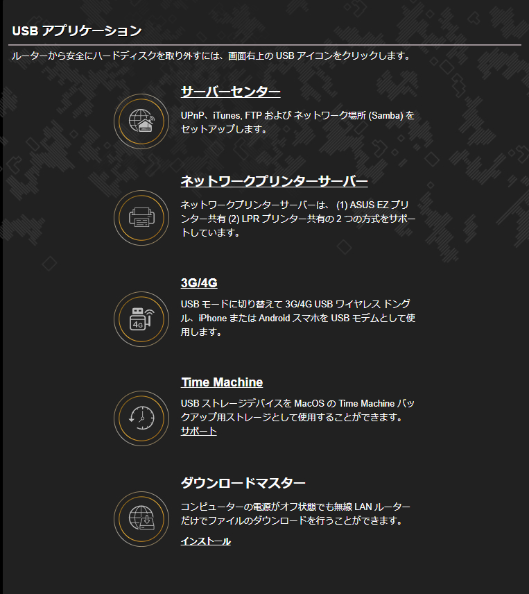 USBアプリケーションでNAS機能やプリンター共有に対応。AiCloudでリモートアクセスも可能