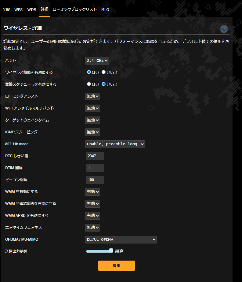 その他の詳細設定も用意されています。ビームフォーミング(特定のデバイスに電波を集中させる技術)、MU-MIMO(複数デバイスへの同時通信)、AirTime Fairness(低速デバイスによる帯域占有を防ぐ)など、高度な機能をON/OFFできる仕様です。特定の用途で問題が発生した場合は個別に調整できるため、上級者には嬉しいポイントといえます。