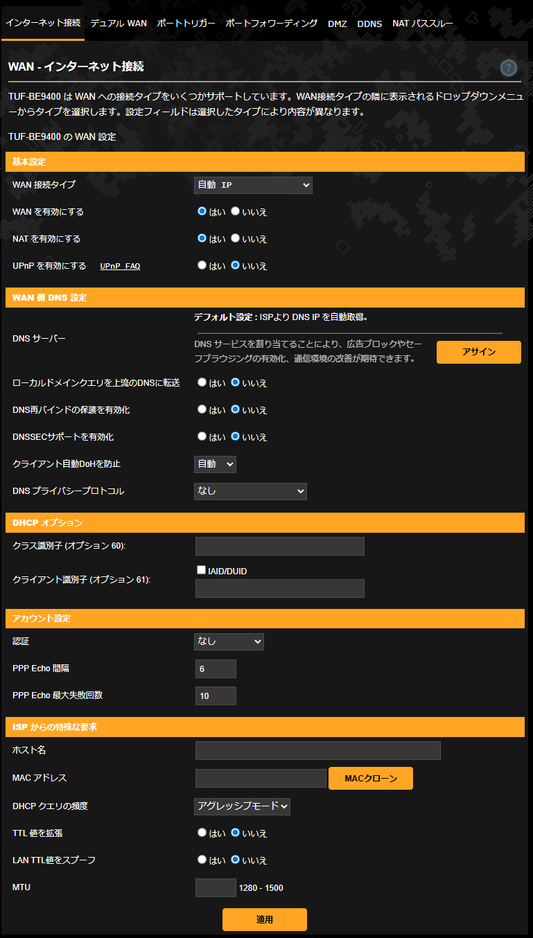 WAN設定では、インターネット接続の詳細な設定が可能です。接続タイプは、PPPoE、DHCP、固定IP、L2TP、PPTPなど主要な方式に対応しており、プロバイダの仕様に合わせて柔軟に設定が可能。MTUサイズやDNSサーバーの手動設定にも対応しているため、細かなチューニングが可能です。
