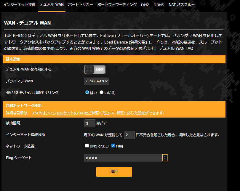 WAN設定は豊富でデュアルWAN対応も可能。フェイルオーバーとロードバランシングを選択できる