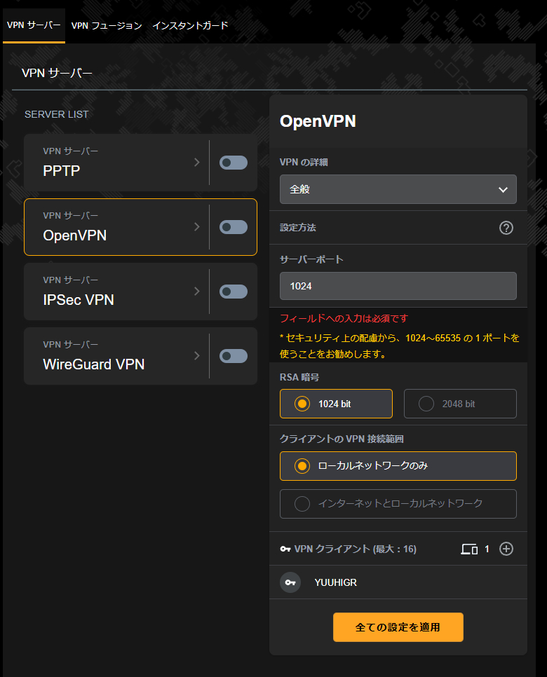 VPNサーバー機能も搭載しており、外出先から自宅のネットワークに安全にアクセスできます。OpenVPNとPPTP、L2TP/IPsec、WireGuard VPNに対応しており、用途に応じて選択可能。設定もアプリから行えるため、外出先からでも安全にファイルにアクセスしたり、自宅のネットワーク経由でインターネットを利用したりといった使い方ができます。VDSL方式のマンションの我が家では残念ながら利用出来ませんが、利用可能な回線であれば便利に利用できるはず。