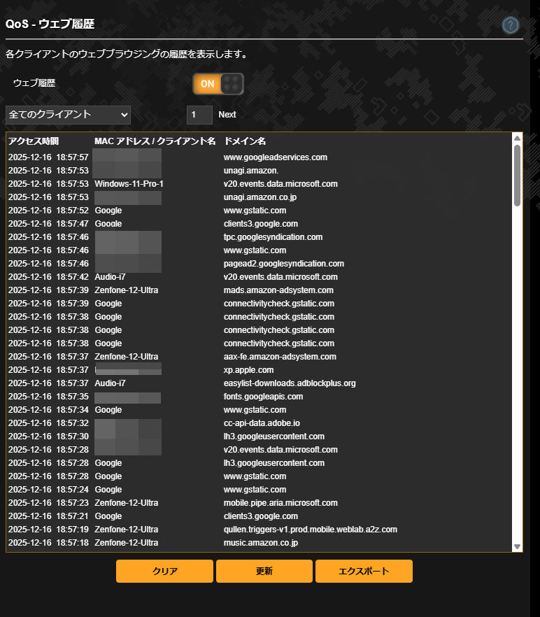 そして驚いたのが、Web履歴機能。クライアント別で、どのWebサイト(ドメイン名)と通信したのかを確認できます。URLの詳細までは見られませんが、ドメイン名だけでも十分に簡易的なネットワーク監視ができるというわけです。