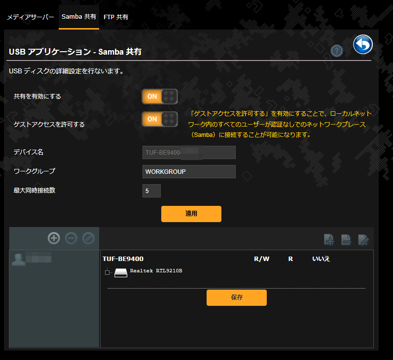 - ファイル共有: Samba(Windows共有)、FTP、両方に対応