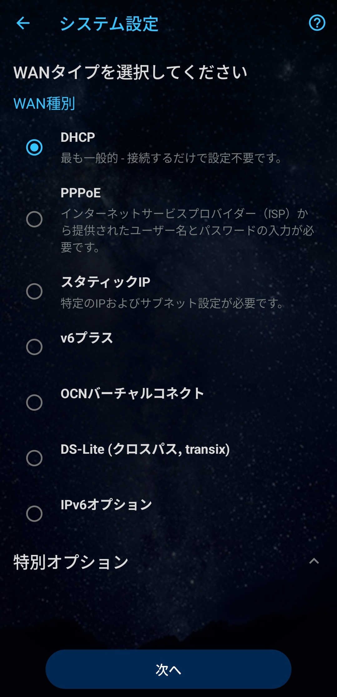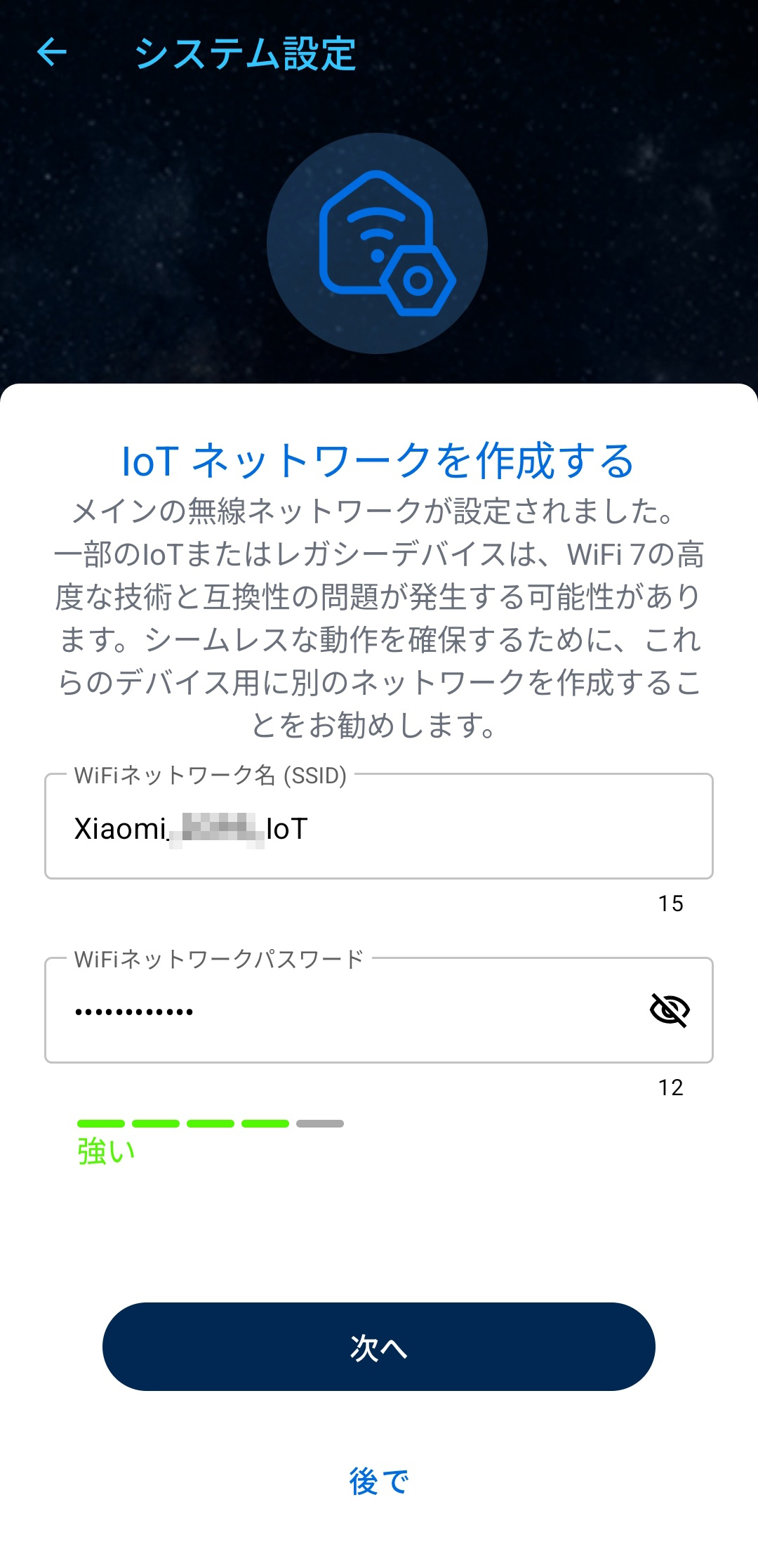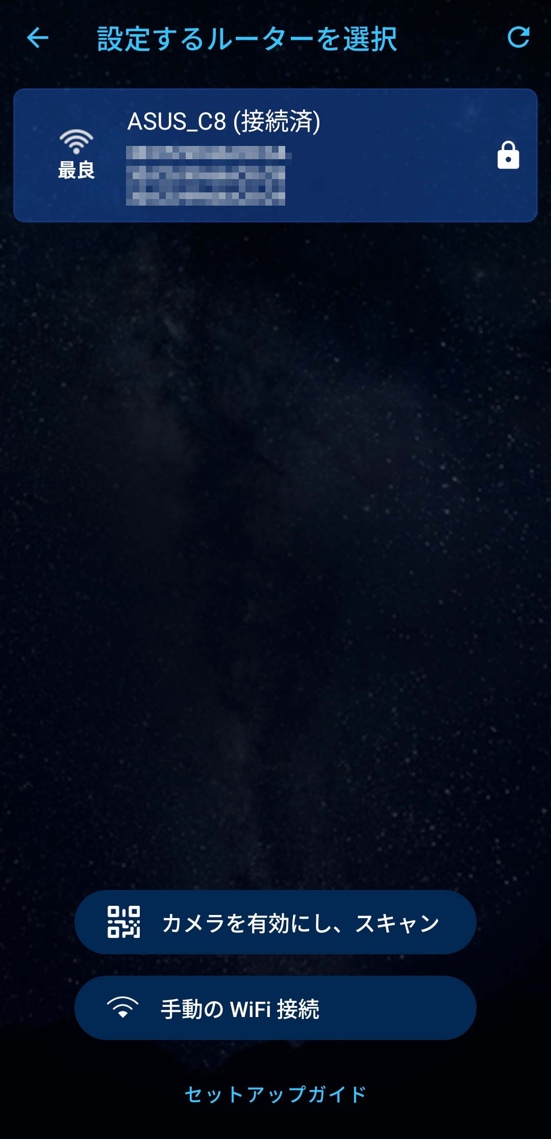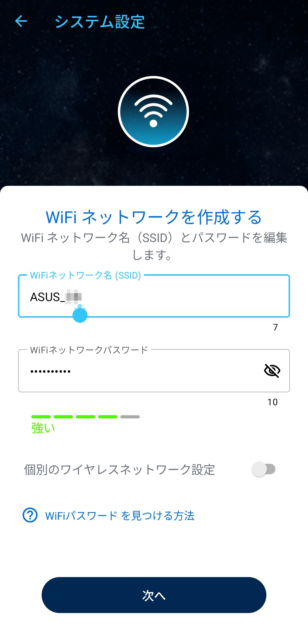 初期設定はASUS Routerアプリを使って行います。セットアップカードに記載されているデフォルトのSSIDとパスワードで接続すれば、すぐにウィザードが起動。アプリの指示に従って、通常利用のSSID・パスワード、IoTネットワークの設定、管理画面のログインID・パスワードを設定していきます。この基本設定だけなら10分ほどで完了。UIも分かりやすく、ルーターの設定に慣れていない人でも問題なく進められる印象。ウィザード形式で必要な項目を順番に入力していくだけなので、迷うこともありませんでした。
