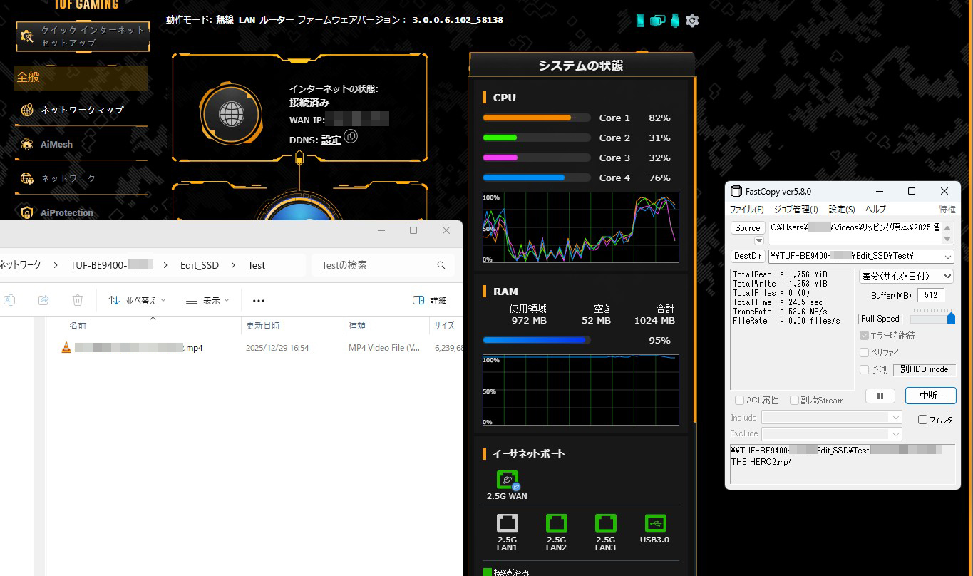 実際に今回はSSDを用意して本体に接続。簡易NASとして利用できるようにセットアップしてみました。ファイルをWi-Fiに接続したPCから転送すると実測で50MB/sほど出ておりかなり高速。Wi-Fi環境でこの速度でデータ伝送ができる簡易NASをセットアップできるとなると、個人的にはかなり重宝する印象です。