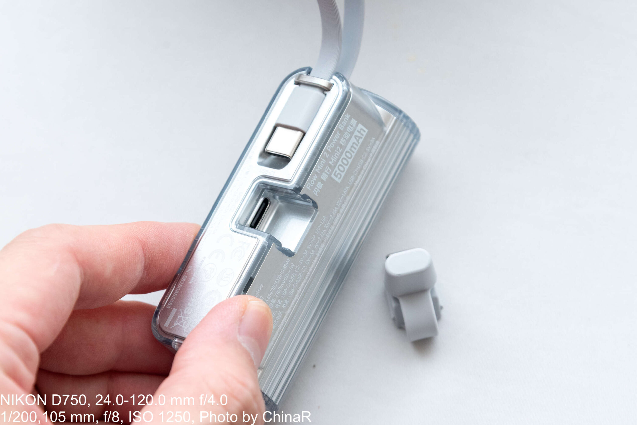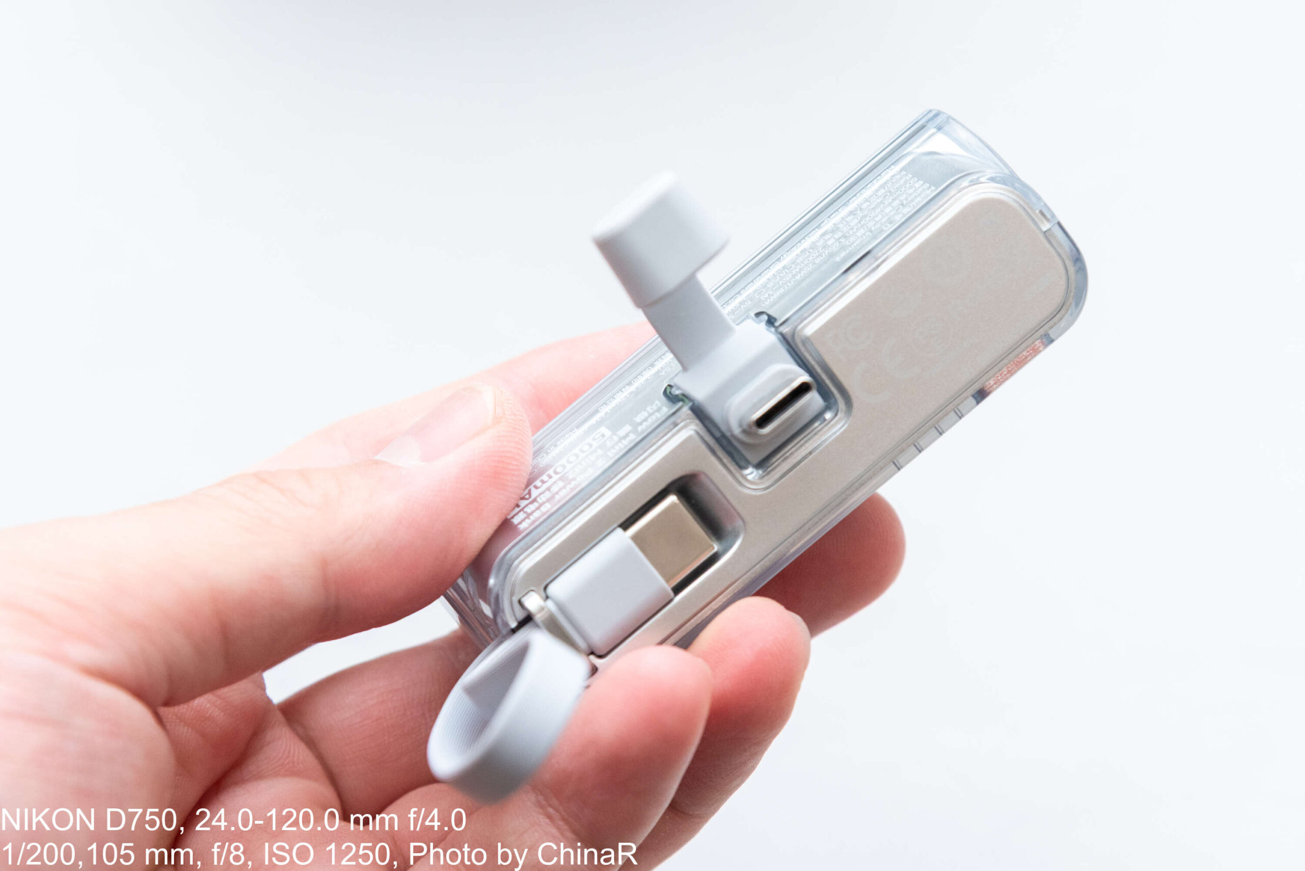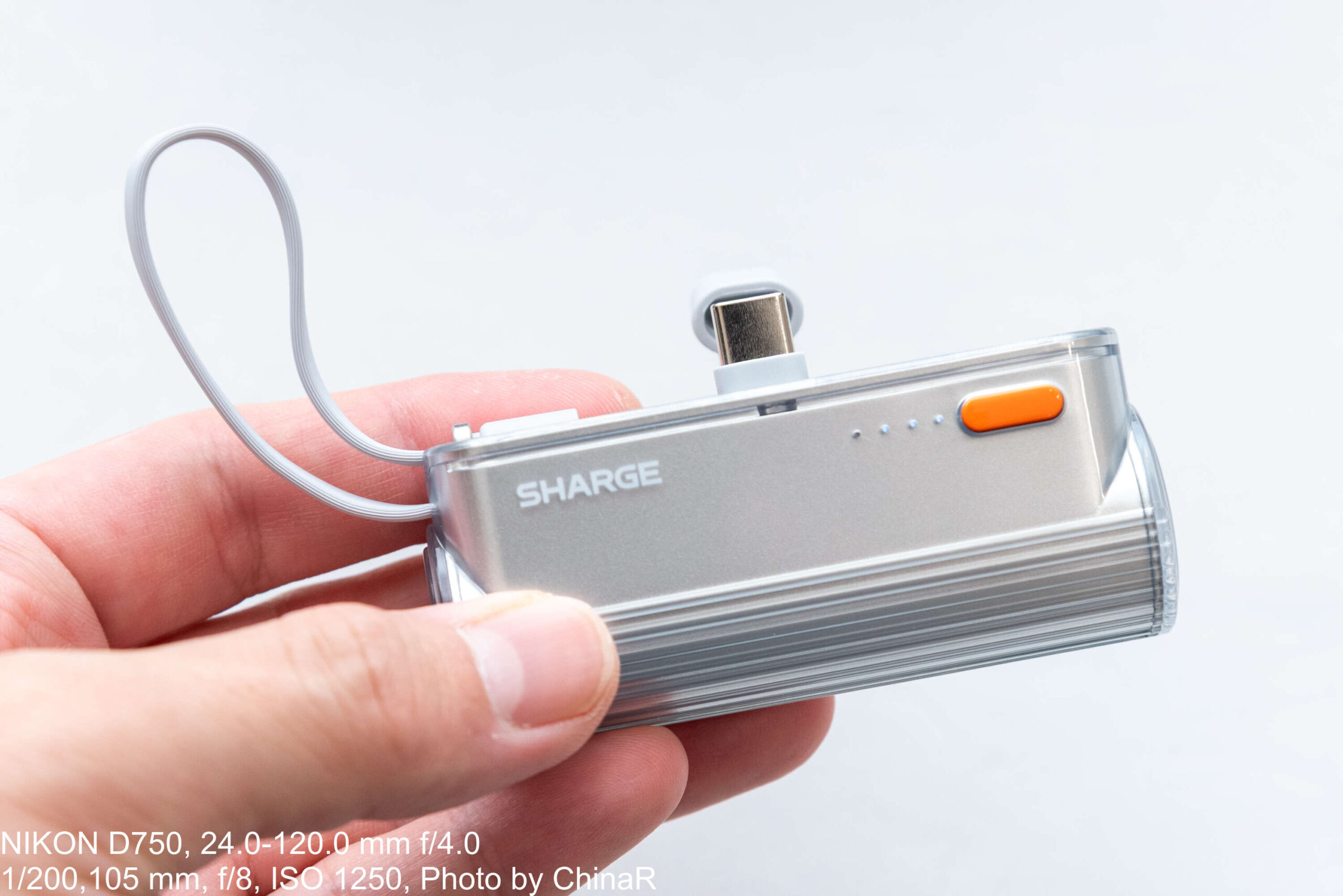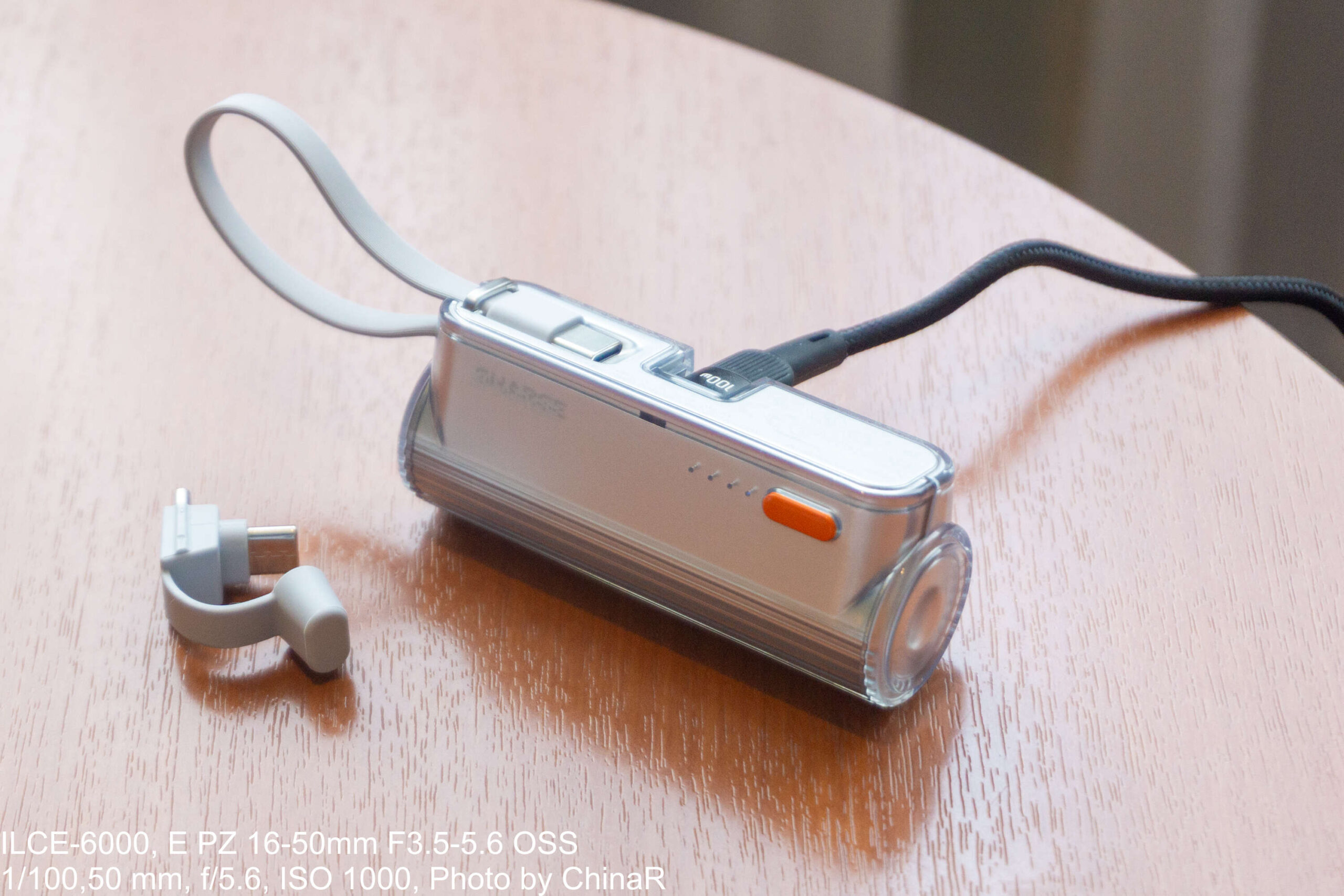 本体のデザインは全体が透明なアクリルで覆われたちょっと不思議なデザイン。シルバーの本体の外側が透明なケースになっていて、ここにボタンや、内蔵ケーブルの収納部が配置されています。搭載する端子は、このスマートフォンに直結させる部分の他に、内蔵のUSB Type-Cケーブルの2つ。