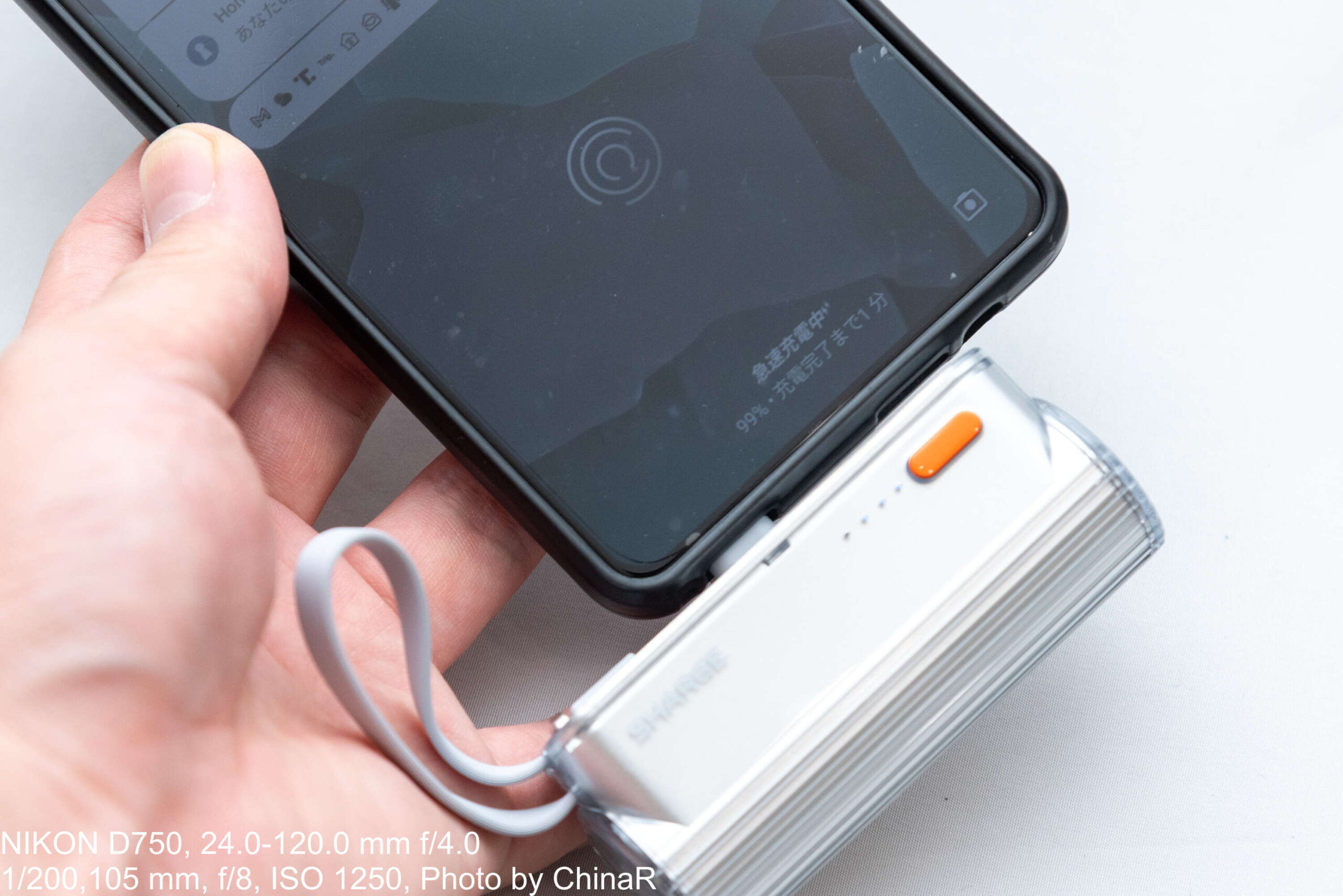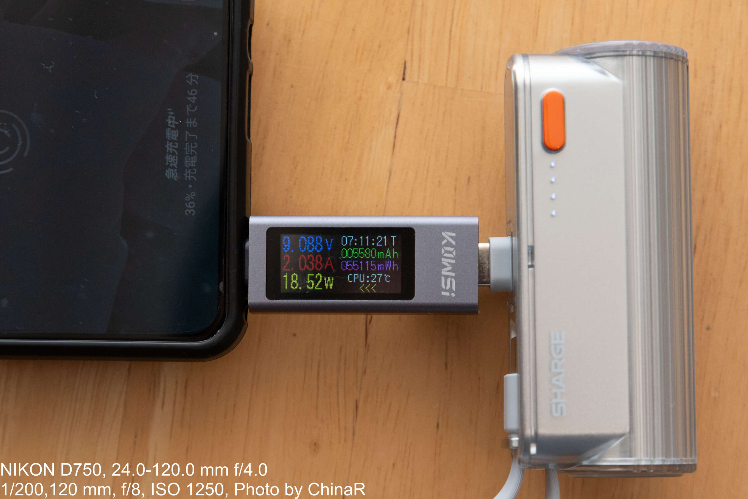 SHARGE Flow Mini 2の充電性能についても確認。フルスピードである22.5Wは出ていませんが、9V/2A=18Wでの充電ができていることが確認できました。前世代のSHARGE Flow Miniは12.5W出力だったので、2倍近い出力にパワーアップしています。これ以上出力を上げようとすると熱が発生してしまい、効率が悪化してしまうため、スマートフォンを十分急速できる22.5W出力というのがちょうどよい範囲なのかも。