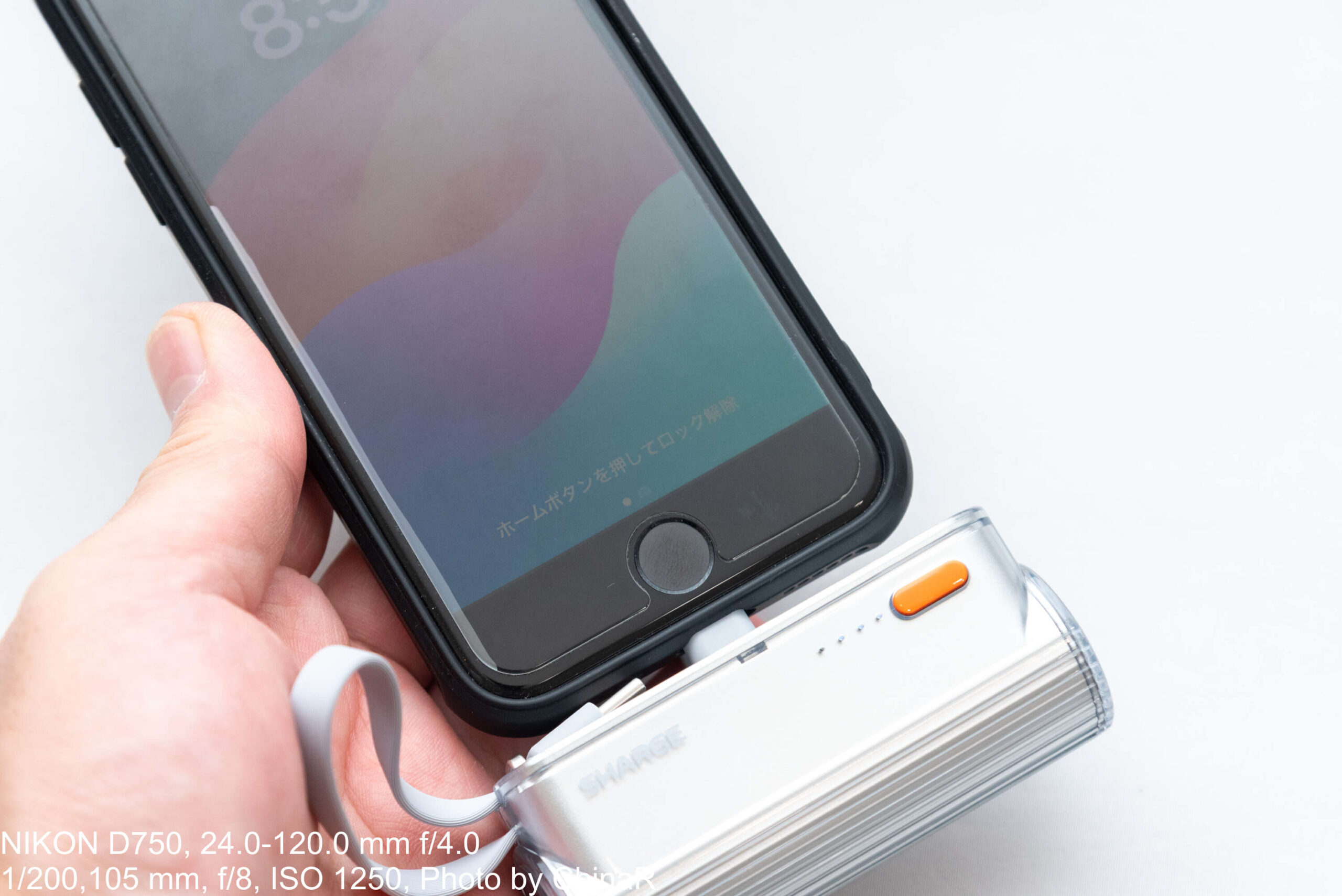 Lightning端子を備えたiPhone SE 3に接続すると写真の形に。SHARGE Flow Mini 2はこの充電端子の長さを一般的な端子に比べて眺めの3.7mmに設定しており、写真のようにスマートフォンにケースを付けていても干渉しないようになっているんだとか。手帳型ケースなどは厚みがどうしてもありますが、これなら安心して利用できるはずです。