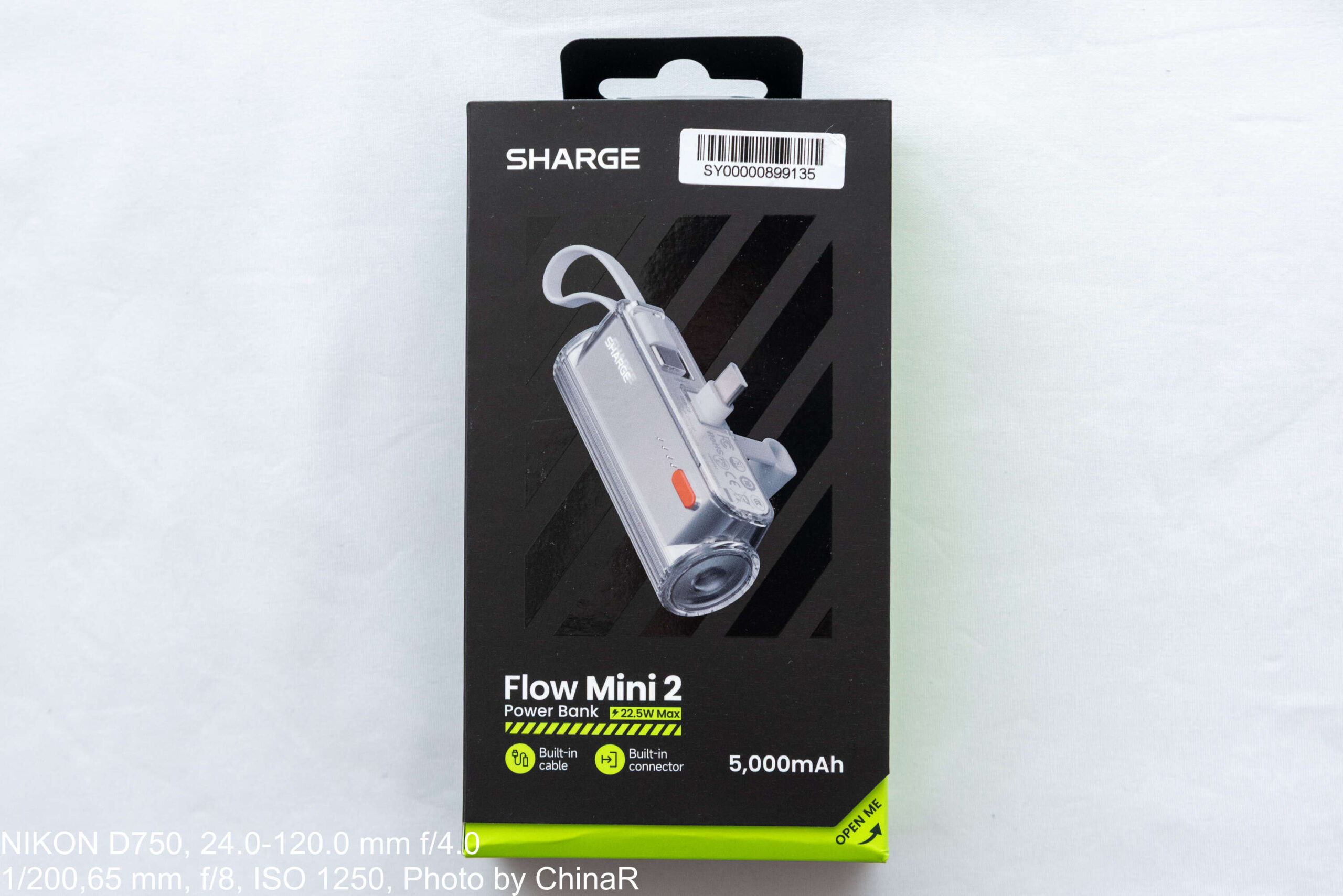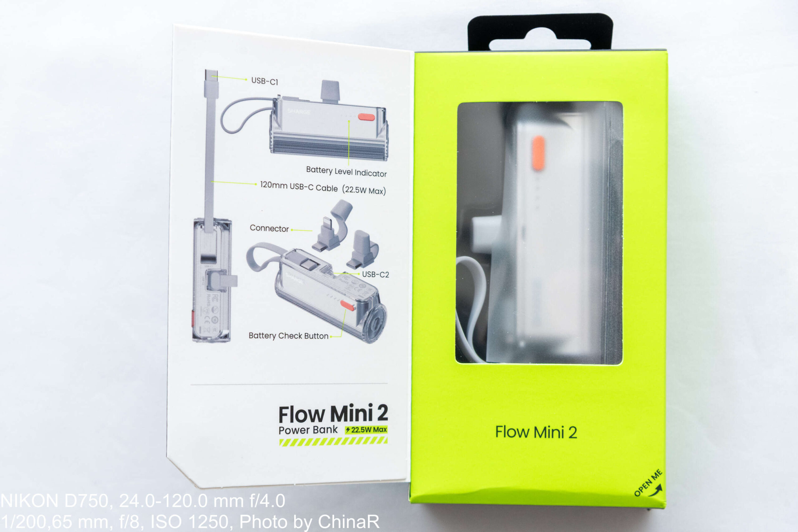 SHARGE Flow Mini 2のパッケージはSHARGE Pouch Miniと同じようにかなり派手なタイプ。黒のパッケージに製品写真と製品名はもちろんのこと、蛍光色でアクセントも入ったデザインです。中扉があるデザインで開けると製品が見えるというギミックもあるおしゃれ、かつ派手なパッケージに仕上がっています。