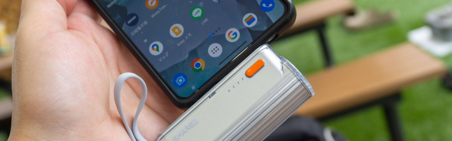 SHARGE Flow Mini 2が便利なのが、とにかく1日中歩き回るようなテーマパークやアウトレットモールへの外出の際。基本的に歩き回っているときは、スマートフォンで情報収集をしたり、必要に応じてアトラクションの予約をするとスマートフォンをどんどん使っていきます。そうすると、バッテリーも心許なくなり充電をしたくなる、というわけ。