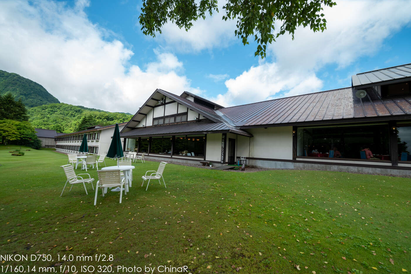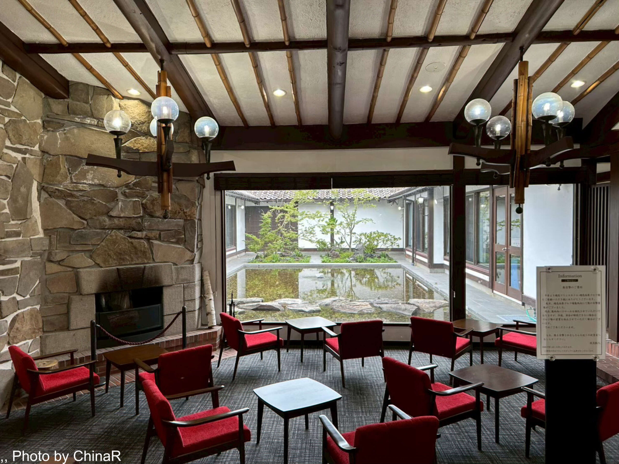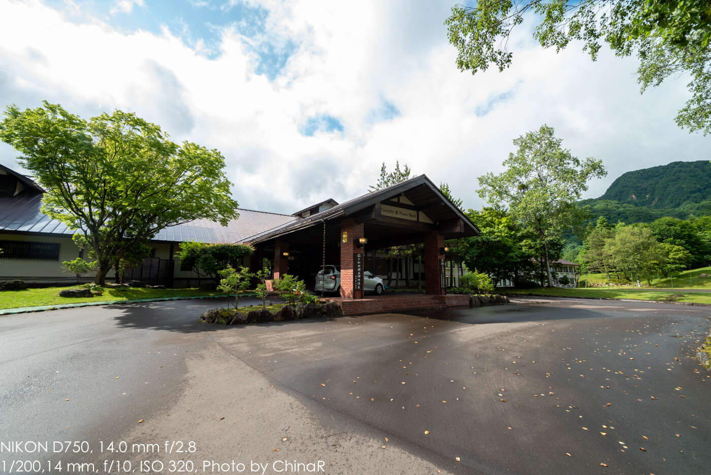 ロビーの先には中庭も配置。中庭を中心に左側にレストラン、右側に売店や休憩室をレイアウト。建物内の動線を自然につなぎ宿泊者が移動しながら緑や光を感じられる空間になっています。建物全体は標高1,100mの高原環境に溶け込むように低層で横長のシルエットになっているのも特徴的。外から見てみると、まさにクラシカルな高原のホテルに仕上がっています。